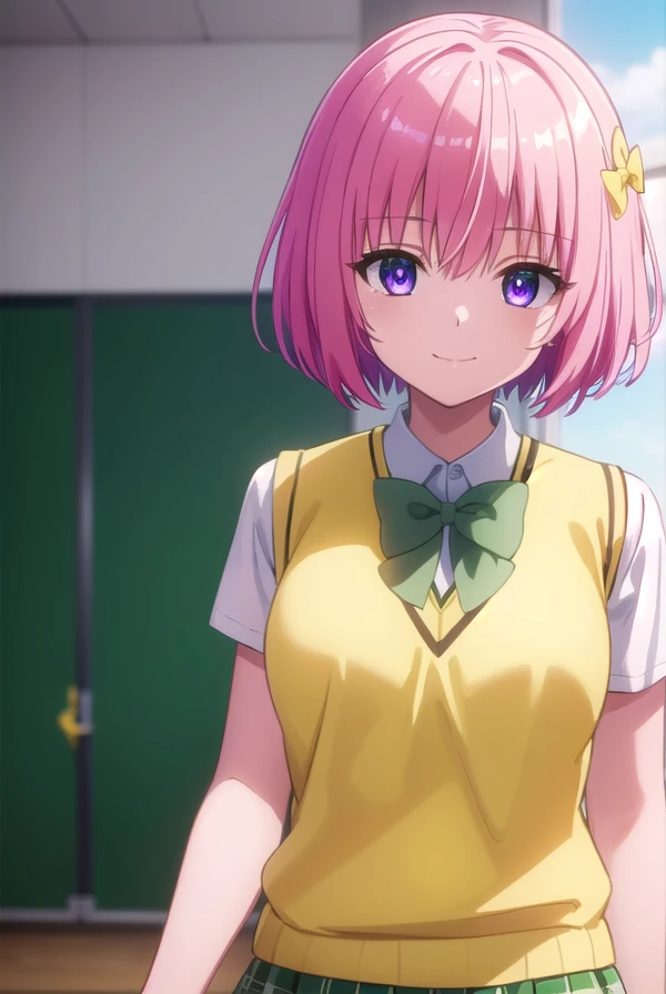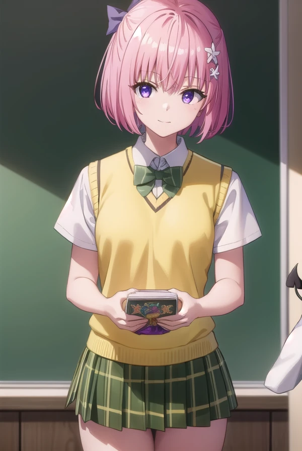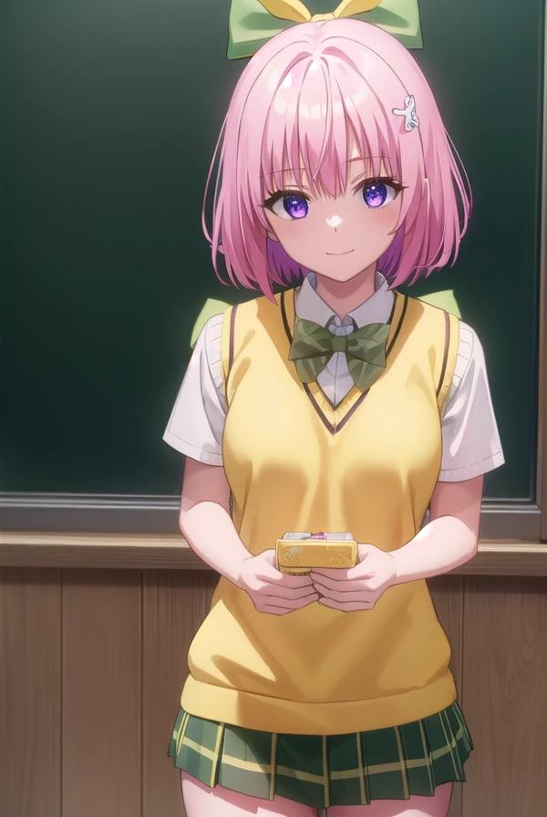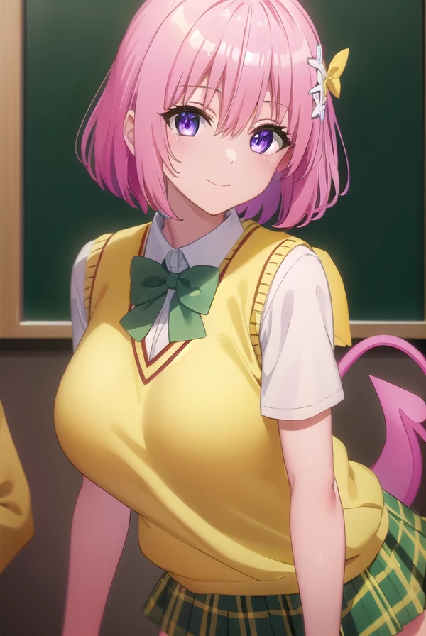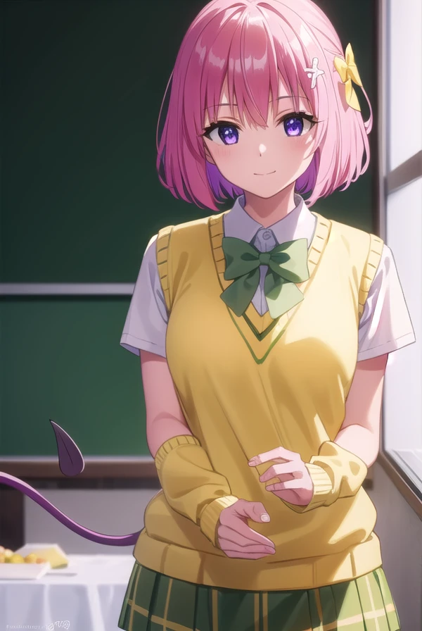 demon tail, green skirt, plaid, plaid skirt, sainan high school uniform, school uniform, skirt, sweater vest, thighhighs, (yellow sweater:1.5), short sleeves, bow, green bow,