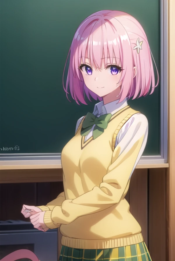 momo deviluke, demon tail, hair flower, hair ornament, (purple eyes:1.1), pink hair, short hair, tail,
