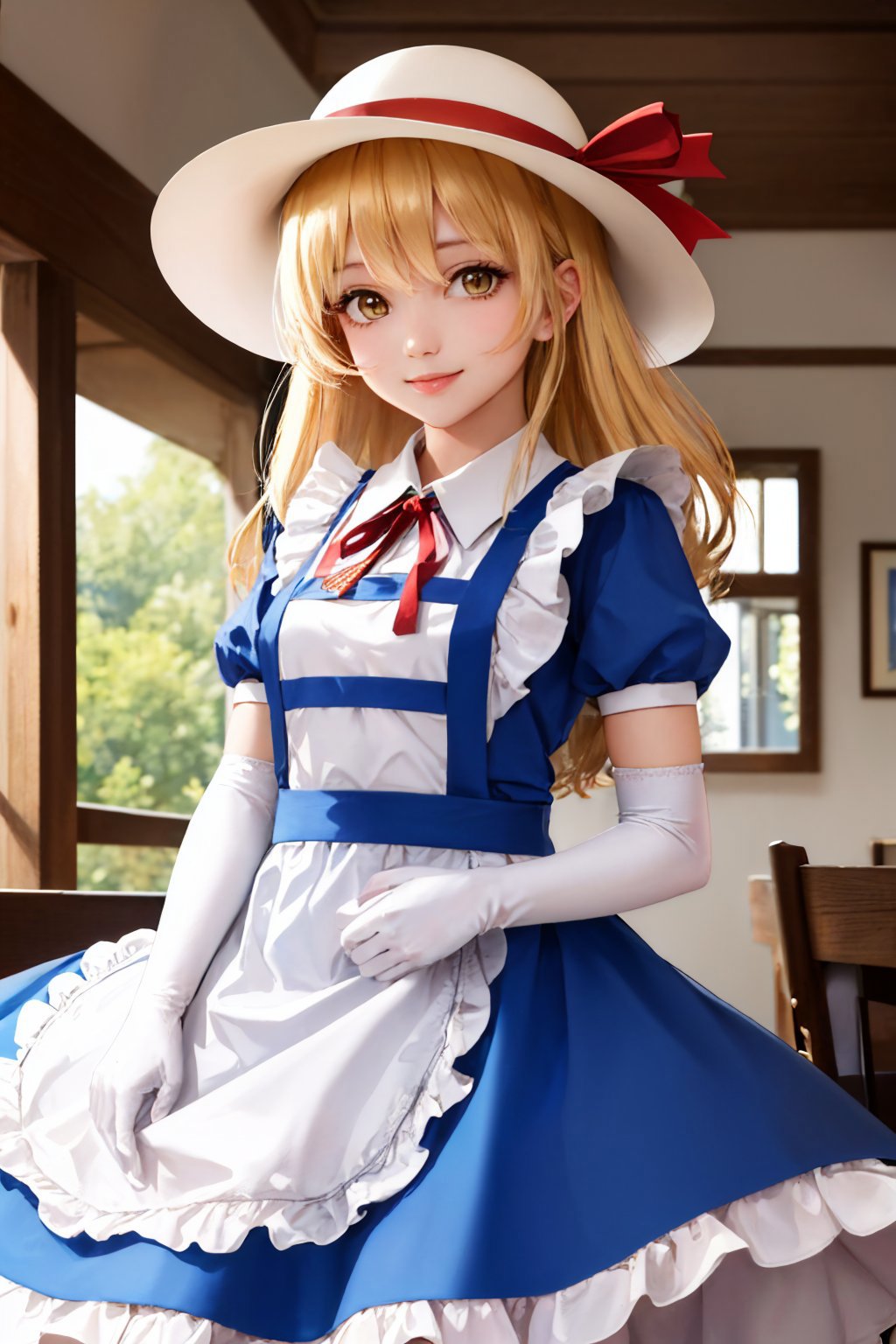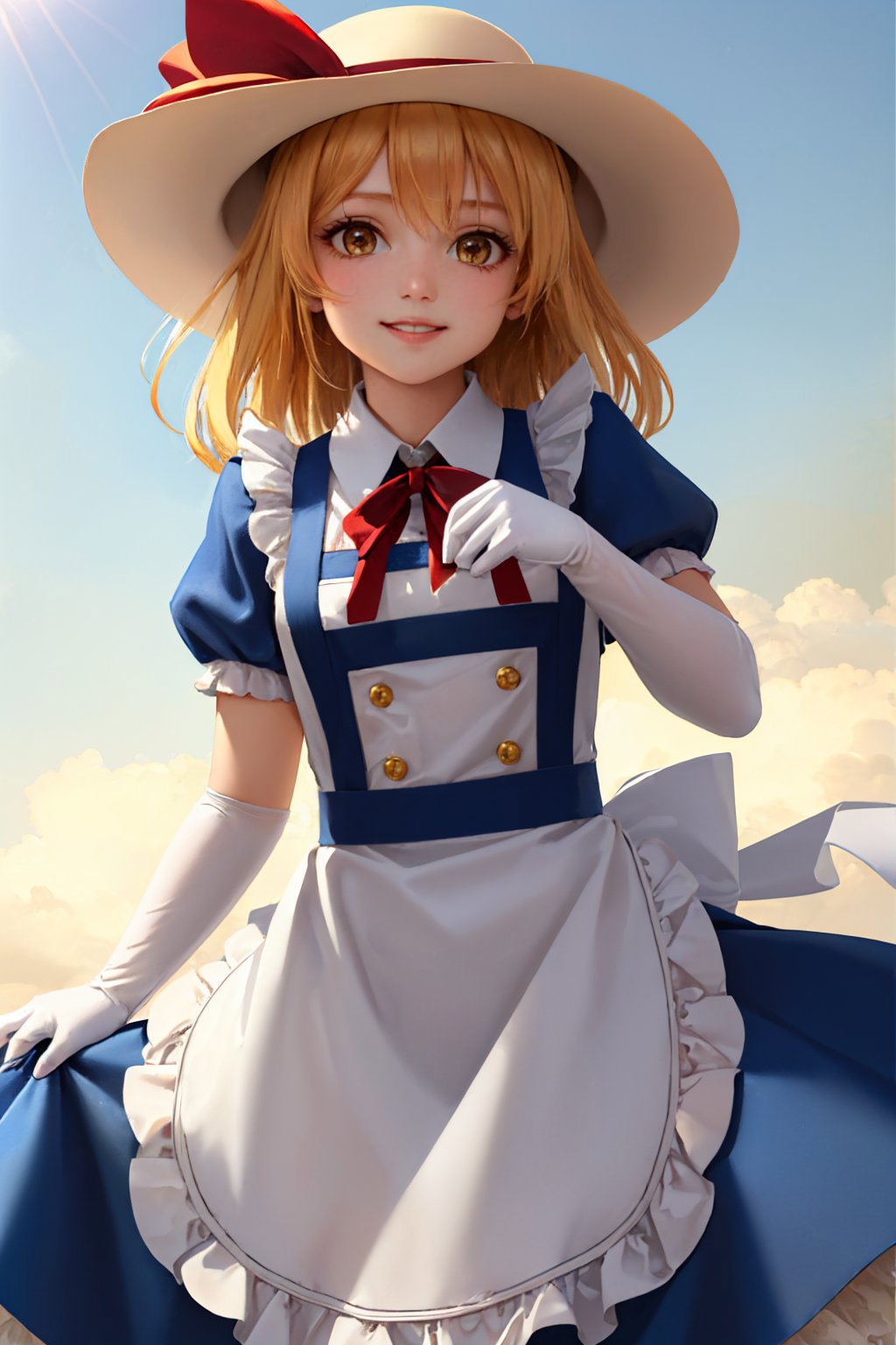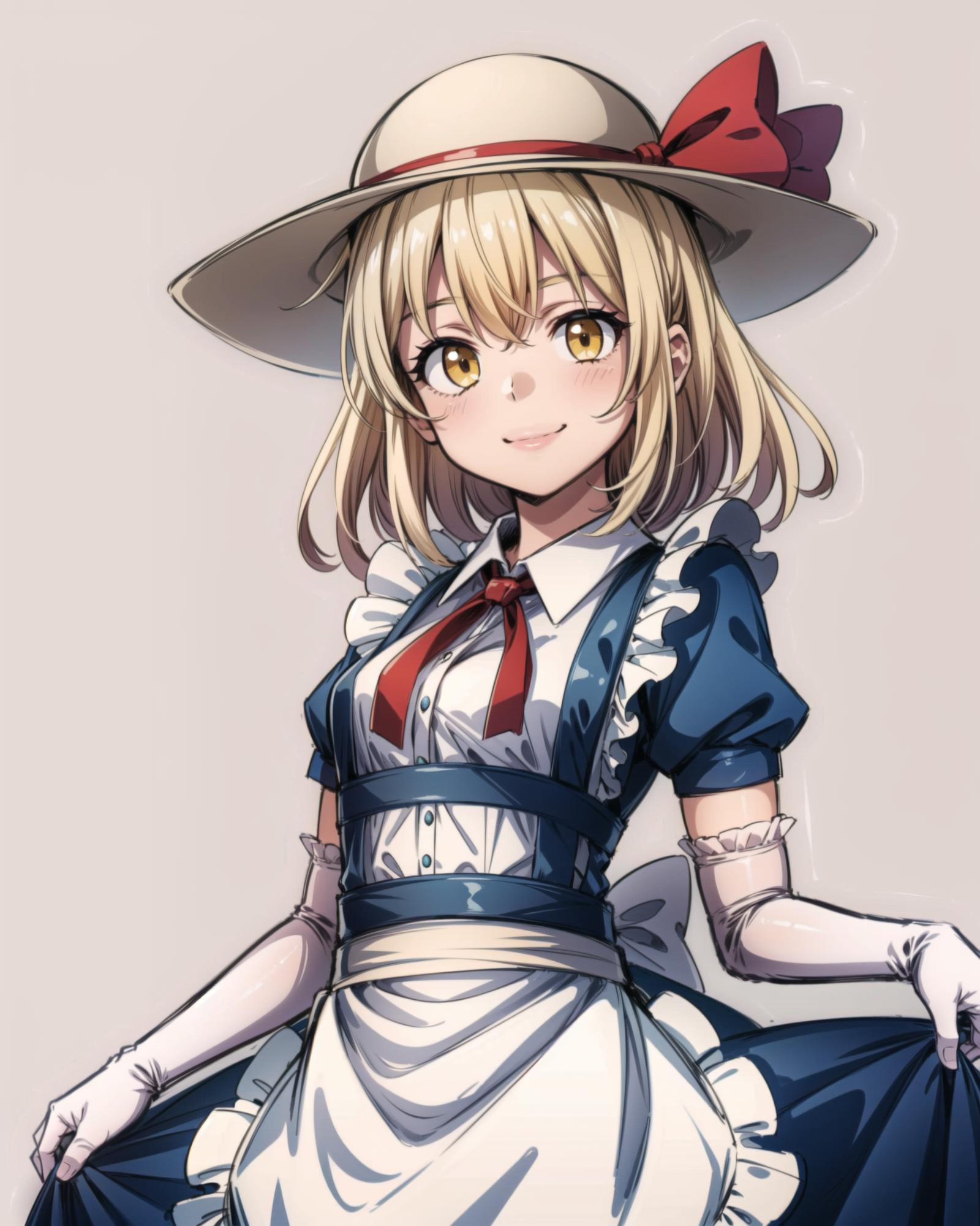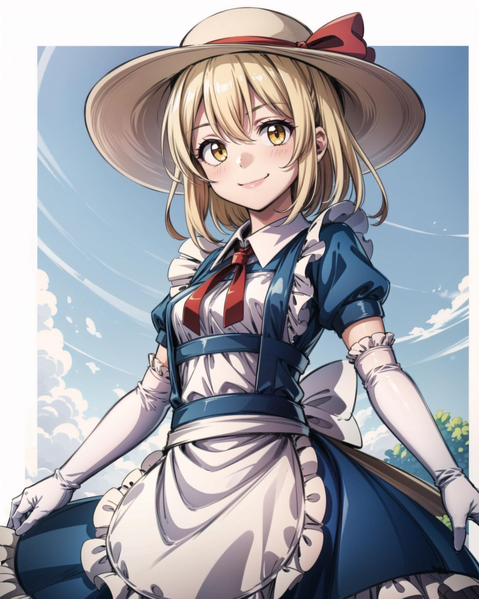 Default Outfit: sun hat, blue dress, apron, short sleeves, ribbon, elbow gloves