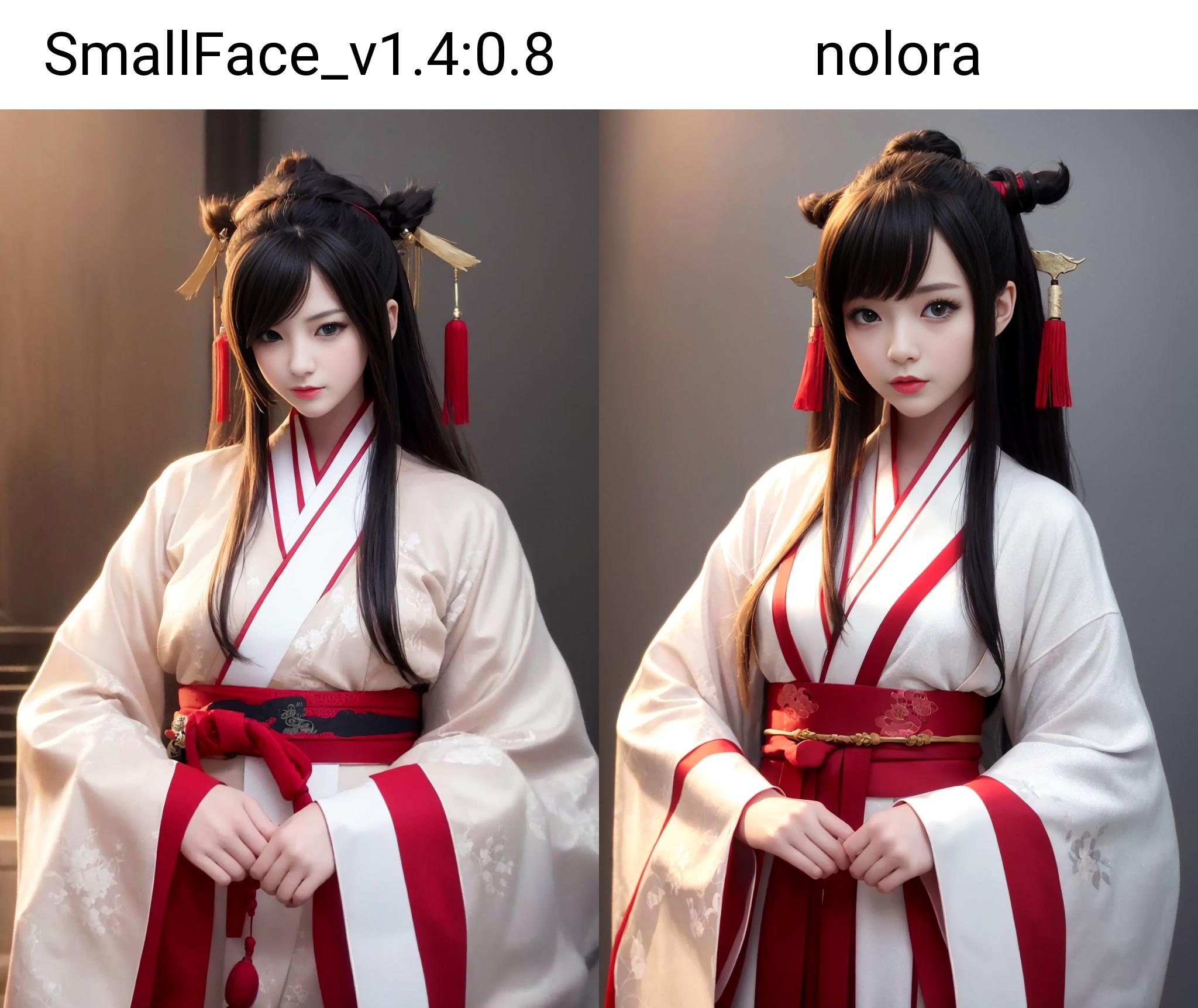· 采用用相同训练集进行PS,然后用小脸的lora减去大脸的lora,因此负权重有大脸的效果,想过去如果是生成Q版小人或许有点用