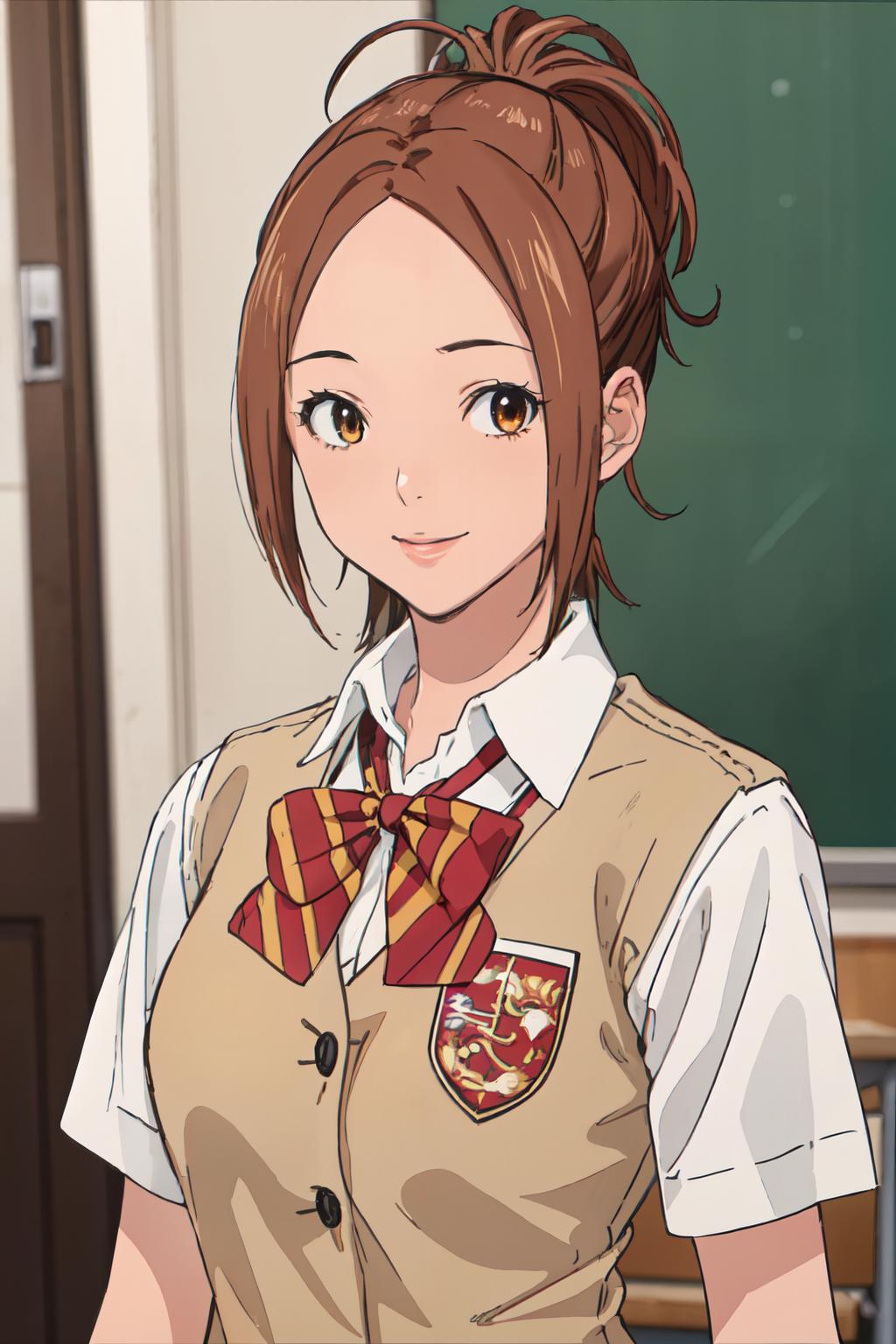 Character: miyoshi kaya, KizukiAi, light brown hair, high ponytail, , orange eyes, parted bangs, forehead