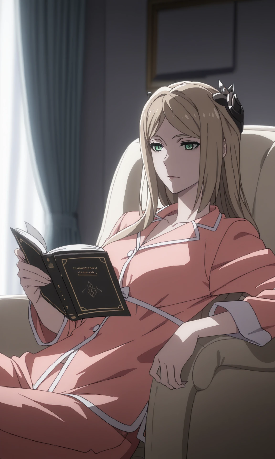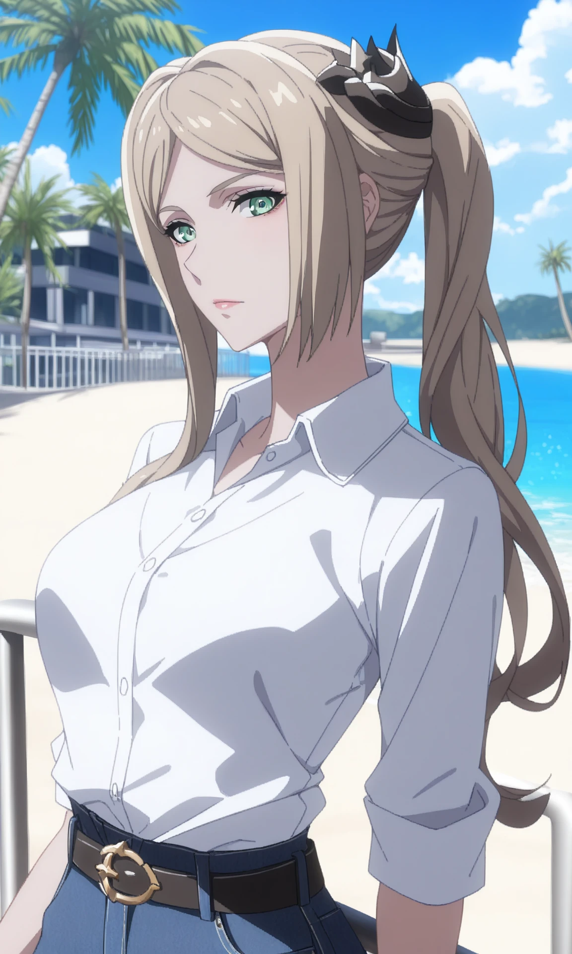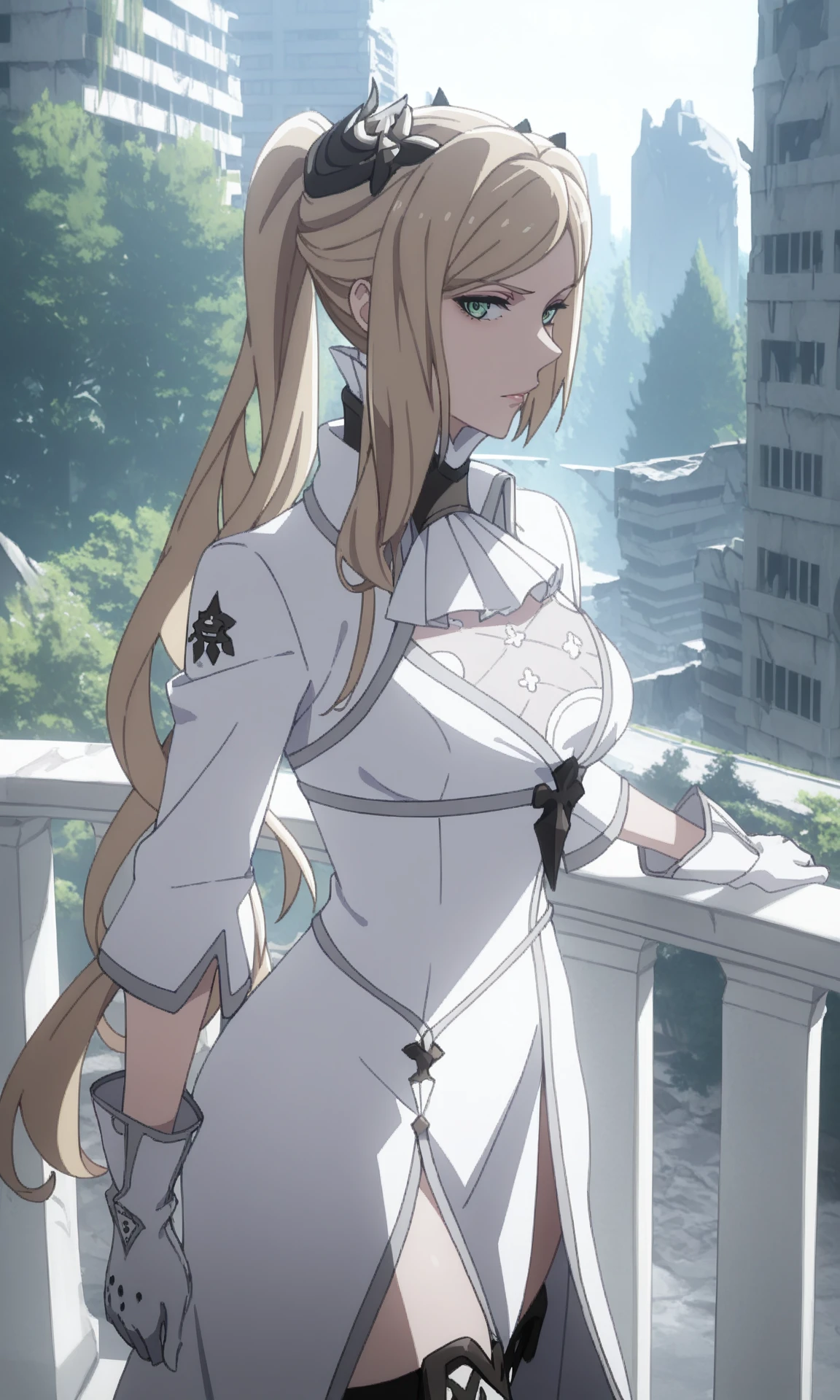commanderwmv, 1girl, green eyes, long hair, blonde hair, hair ornament, ponytail,