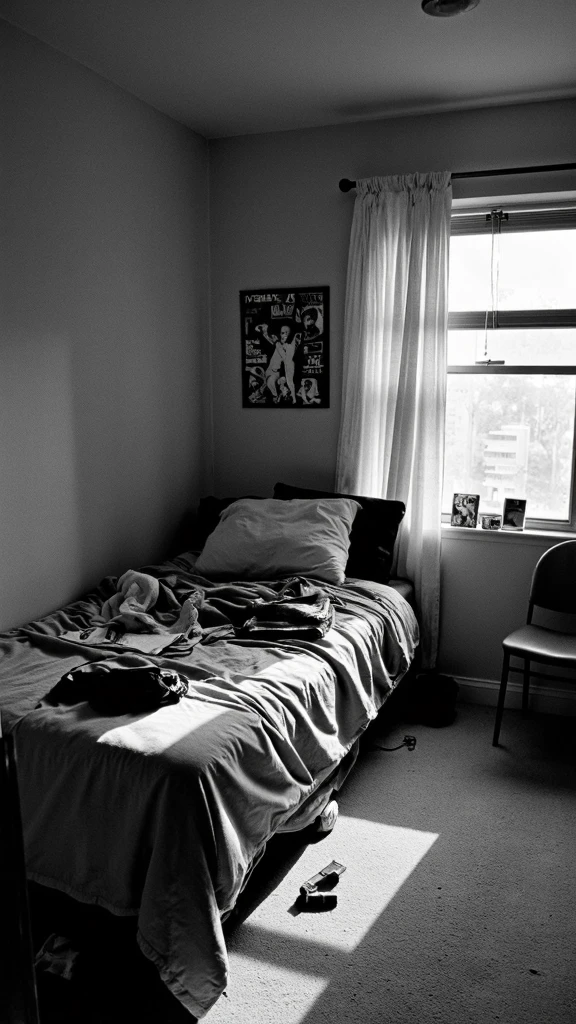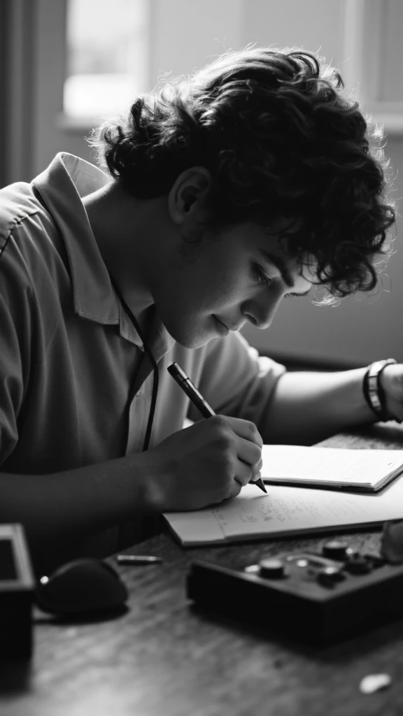 Grayscale Dreams generates black and white images characterized by strong contrast and a sharp rendering of details, creating nostalgic and intimate atmospheres. The composition seems to capture everyday and thoughtful moments, with a focus on human subjects in realistic settings.
