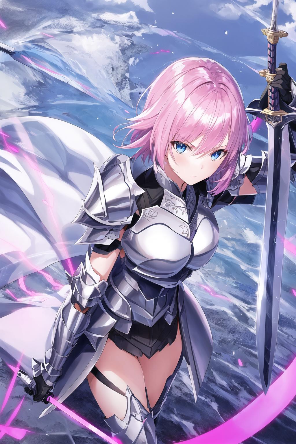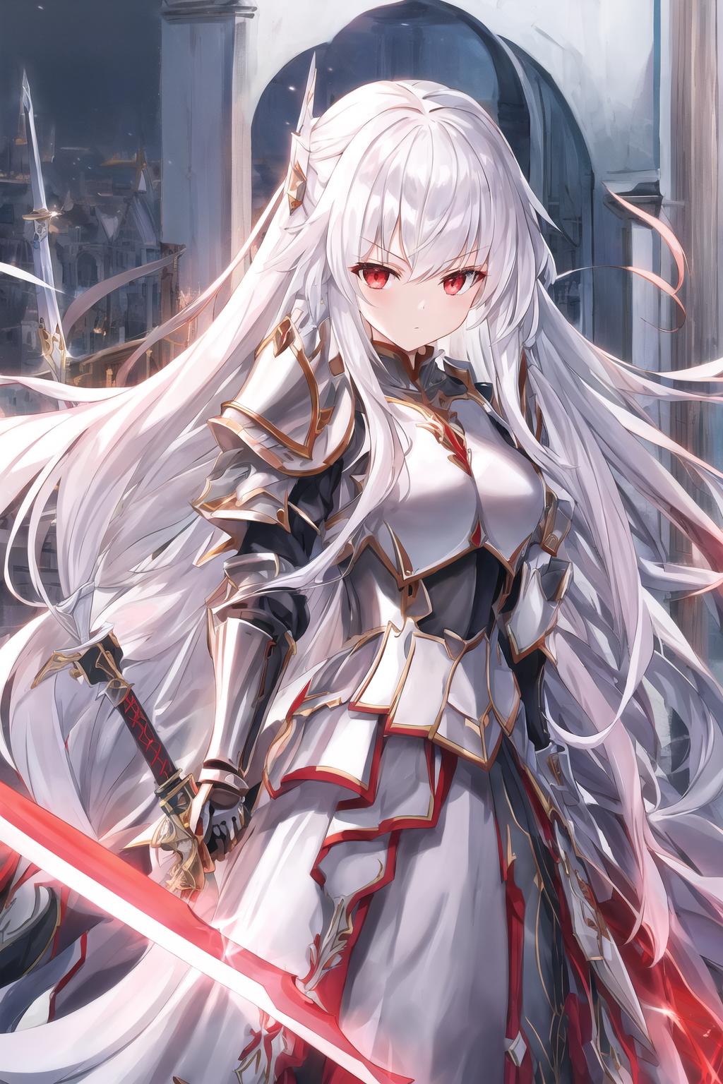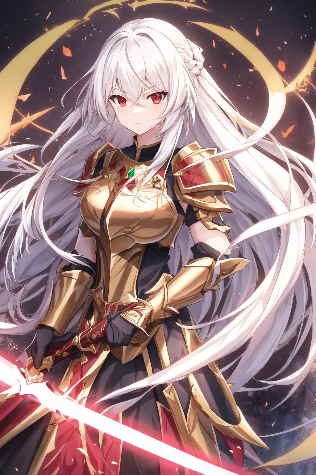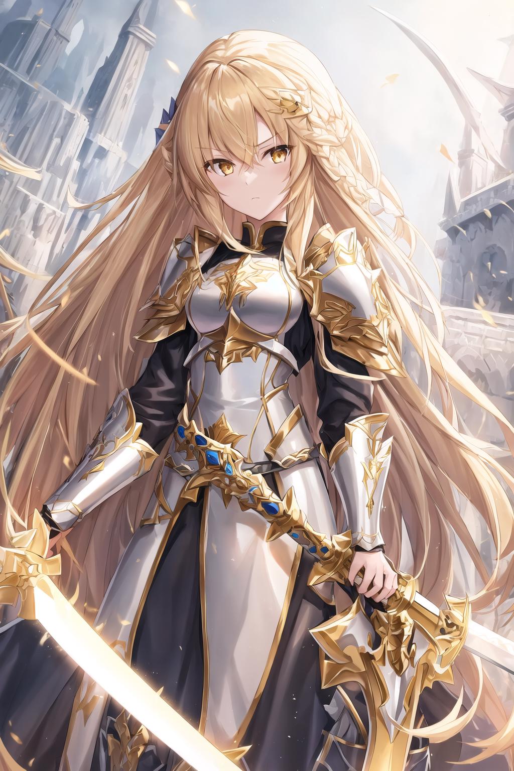 long_hair, 1girl, weapon, sword, armor, holding_sword, holding_weapon, blue_eyes, blonde_hair, holding, solo, looking_at_viewer, very_long_hair, hair_between_eyes, shoulder_armor, bangs, ???????, floating_hair, upper_body