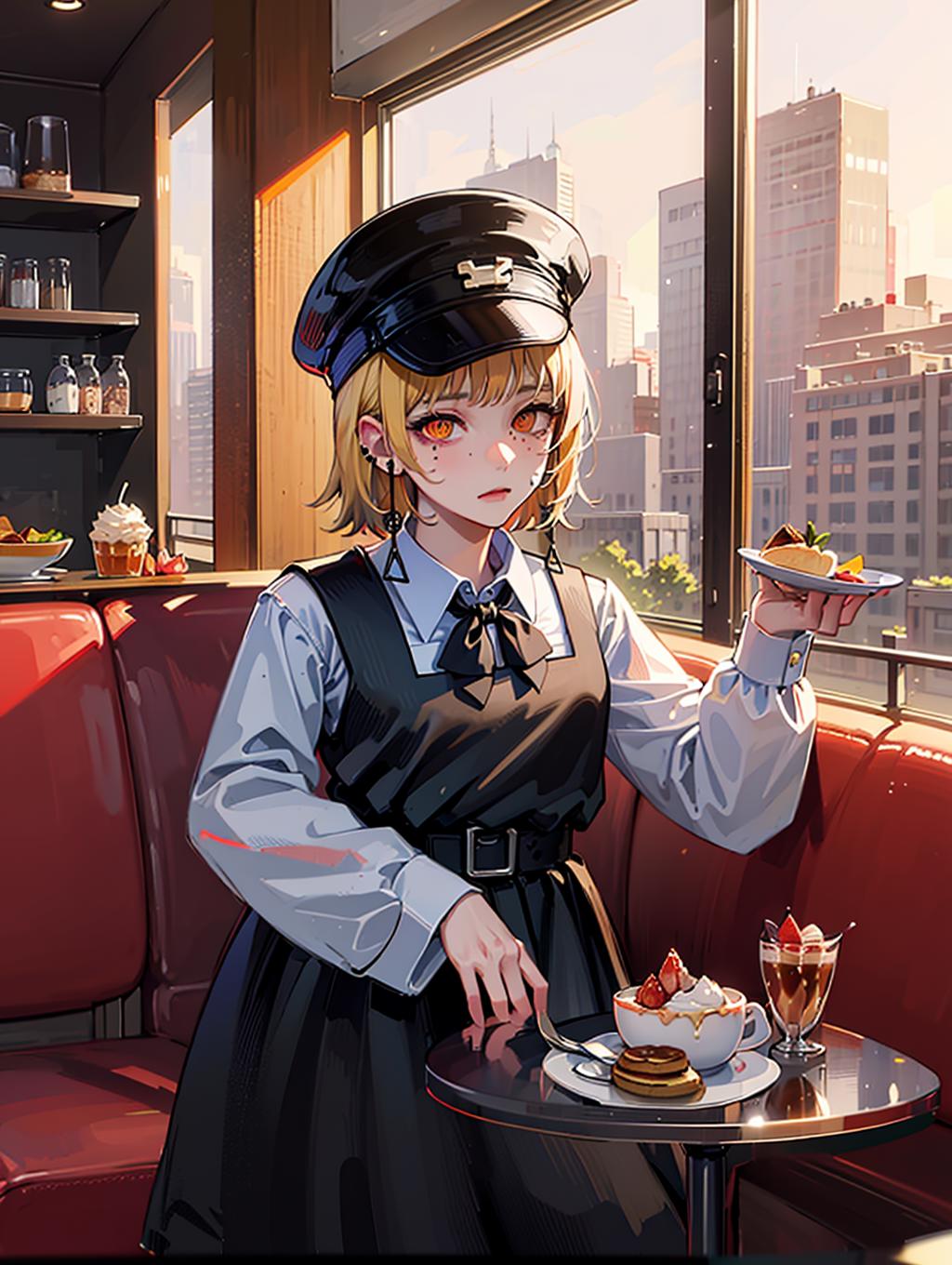 Default Outfit: black hat, school uniform, pinafore dress, white shirt, neck ribbon