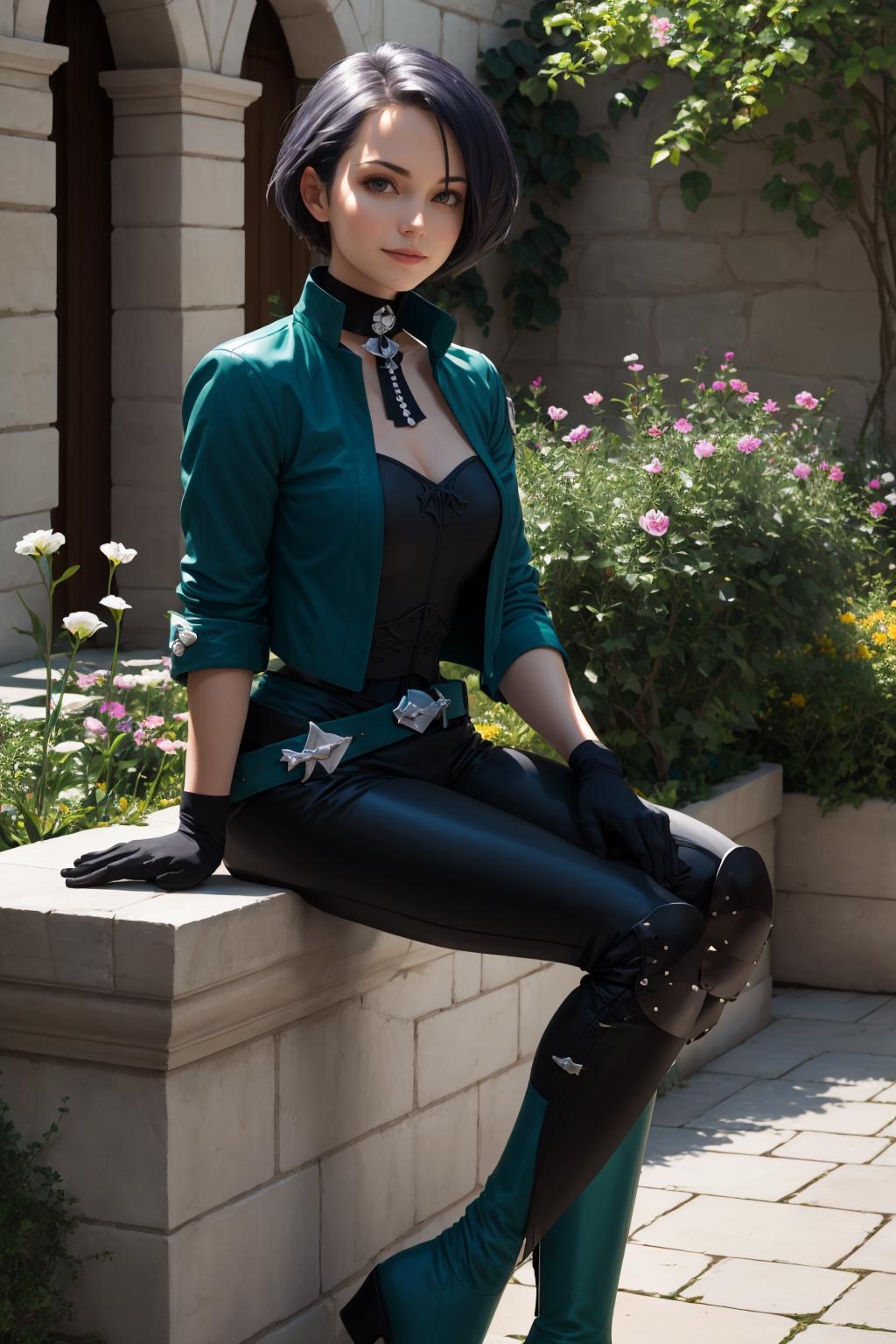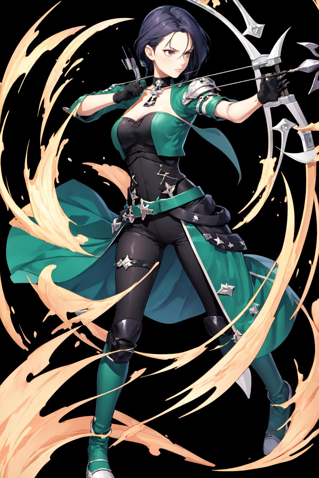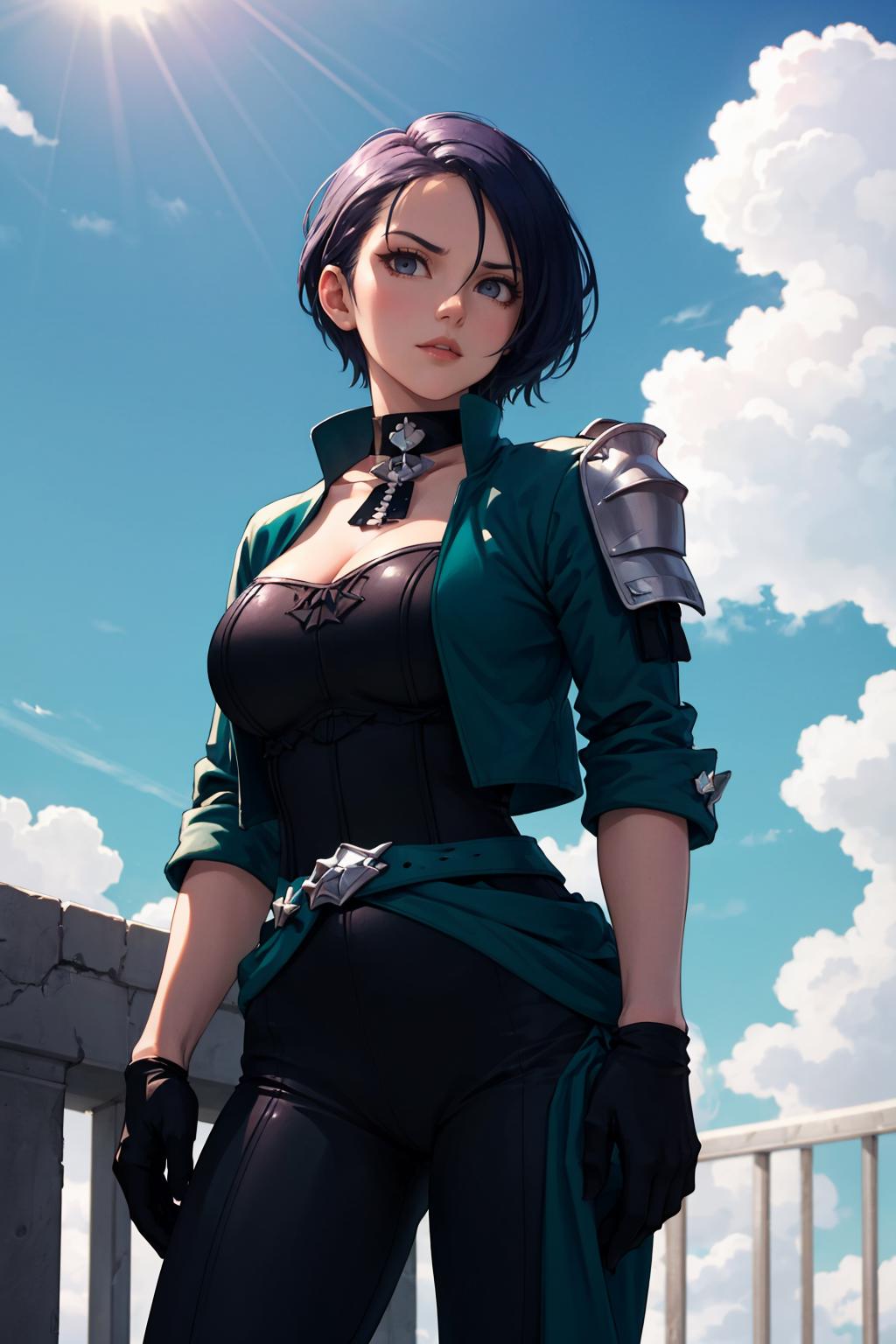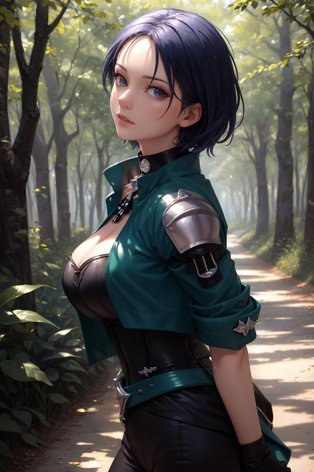 Add "defShamir, collar, shoulder pad, black shirt, black gloves, bodice, green jacket, green belt, black pants, green boots" for her regular appearance.