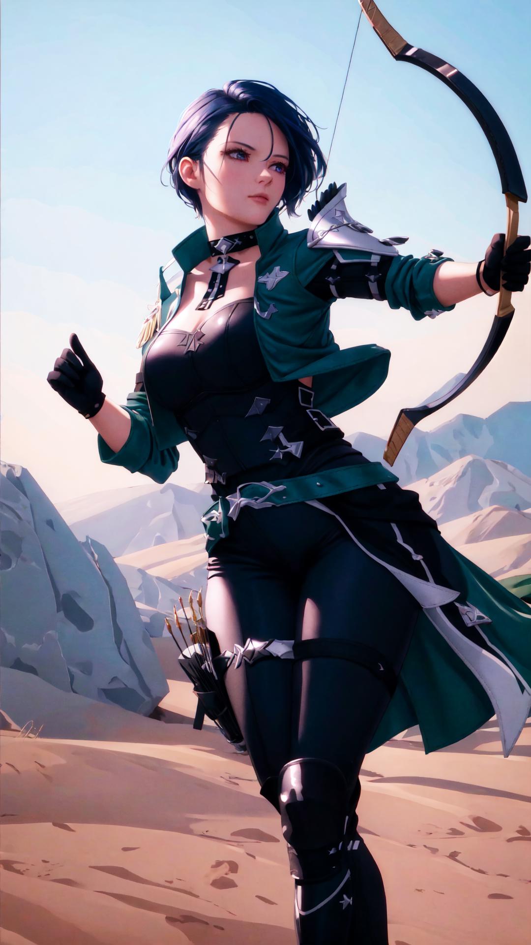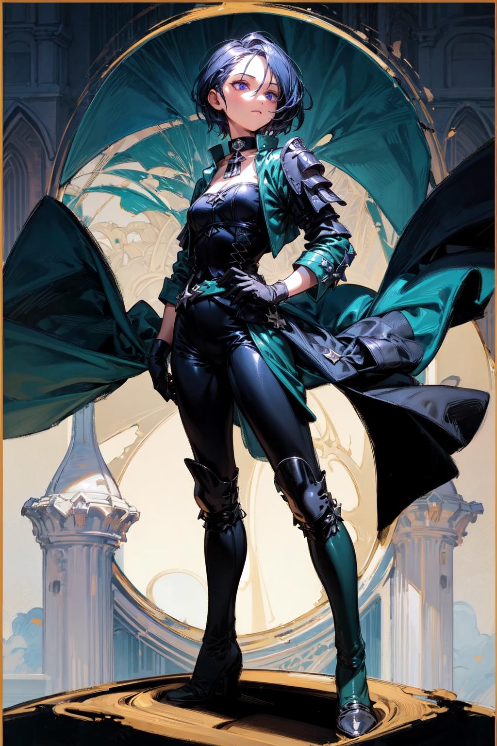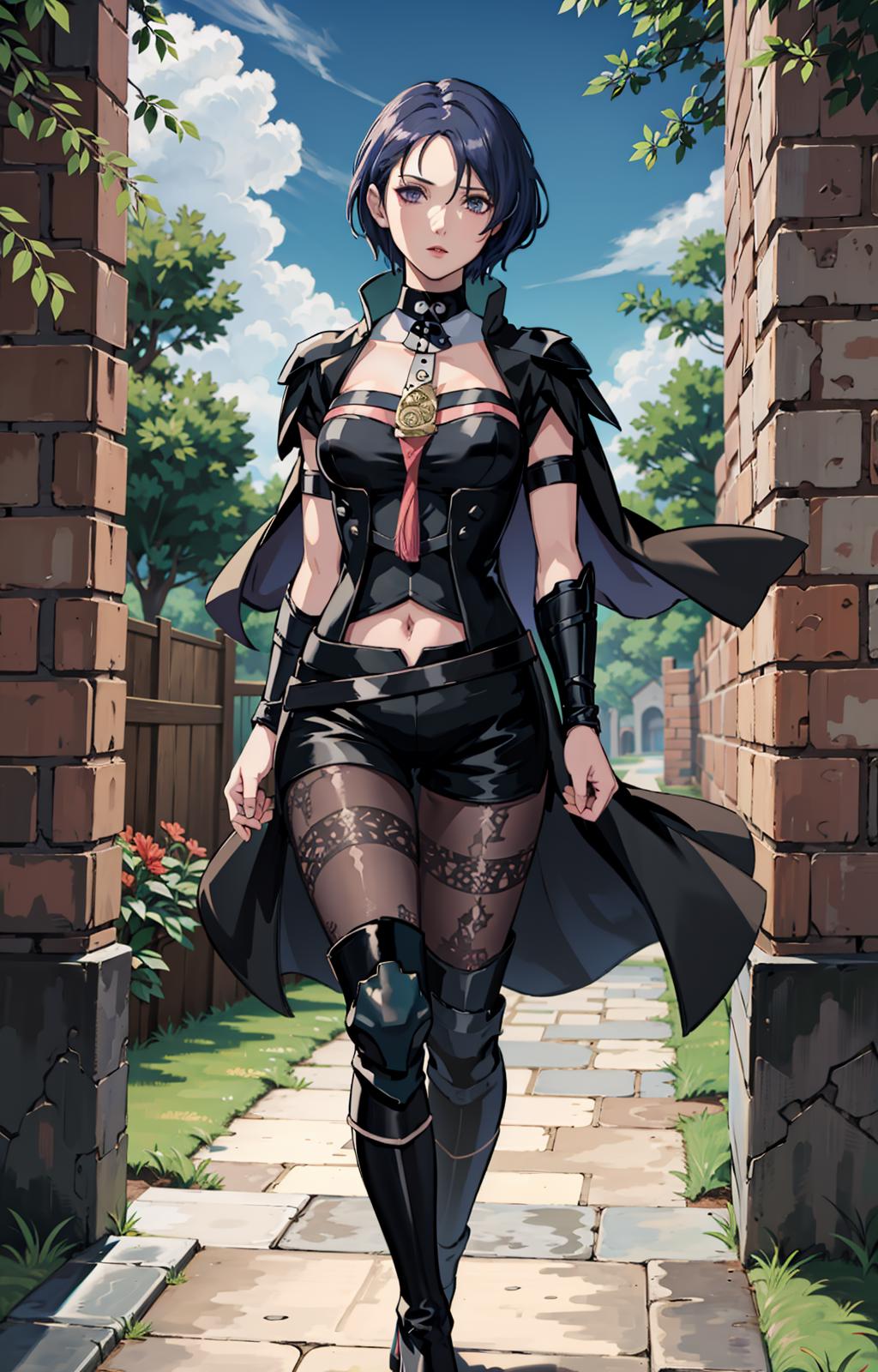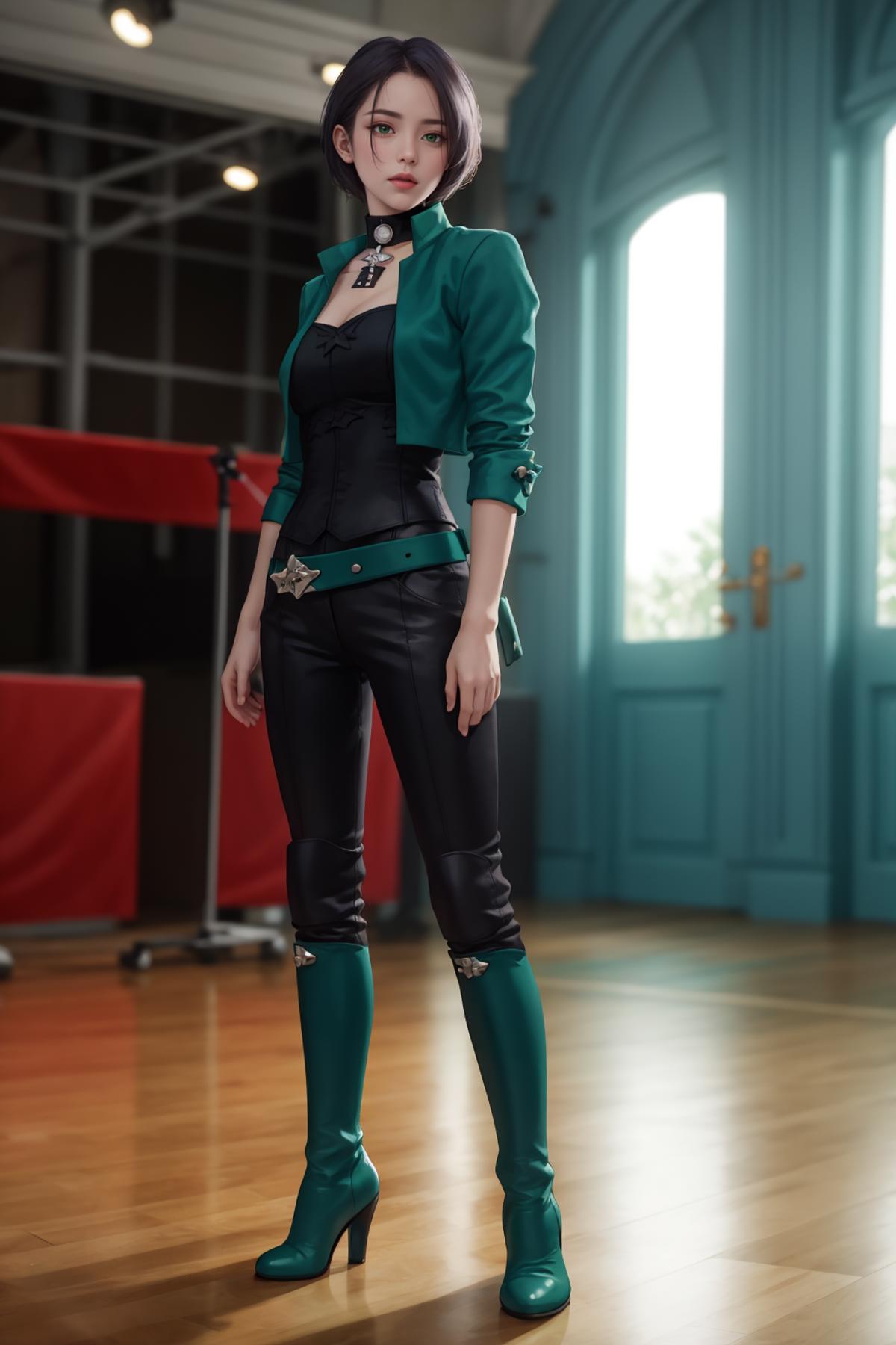 Add "defShamir, collar, shoulder pad, black shirt, black gloves, bodice, green jacket, green belt, black pants, green boots" for her regular appearance.