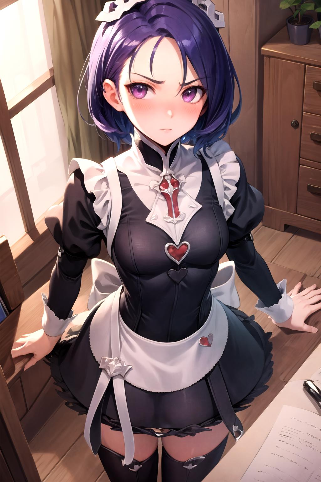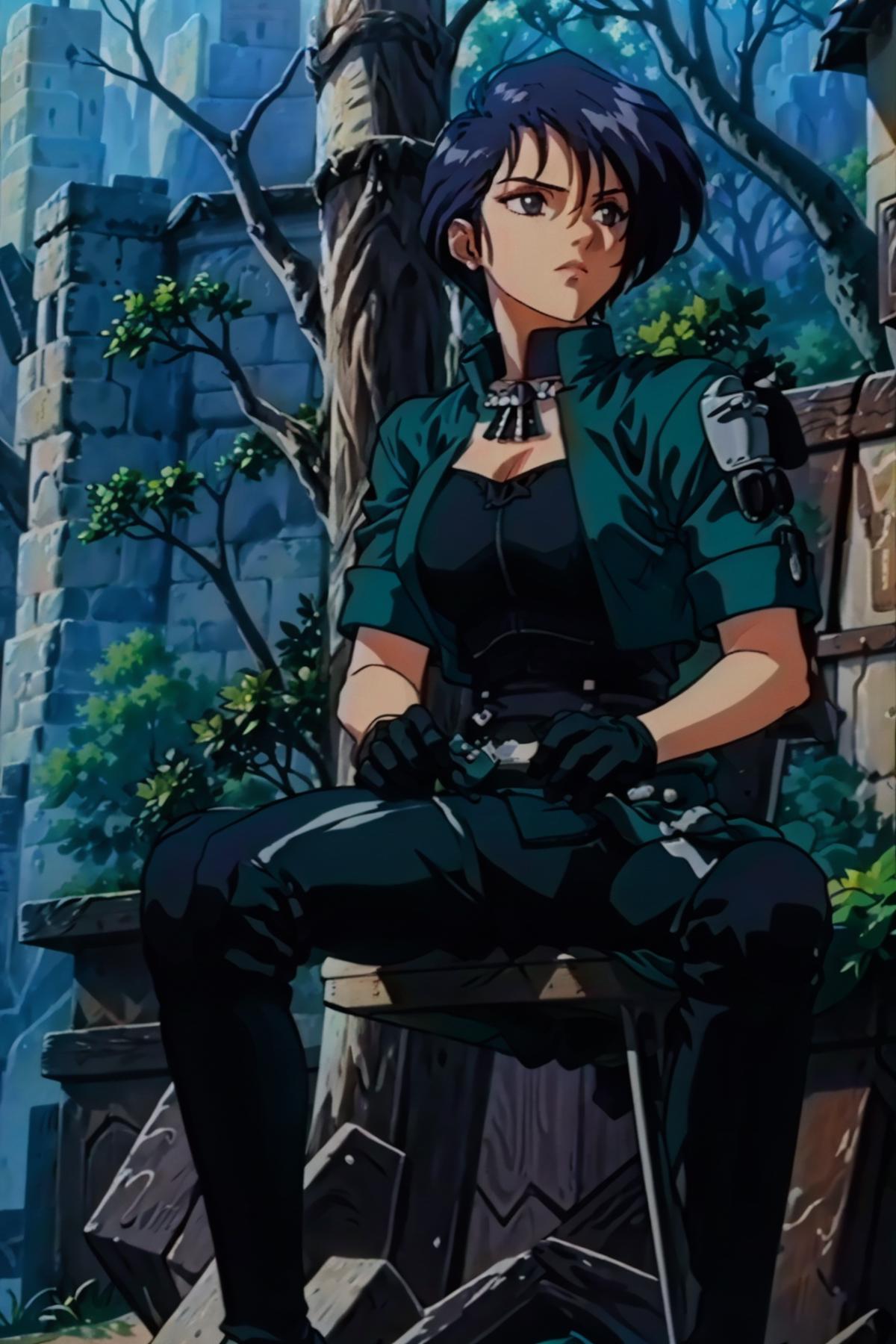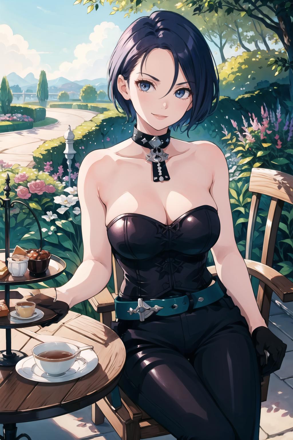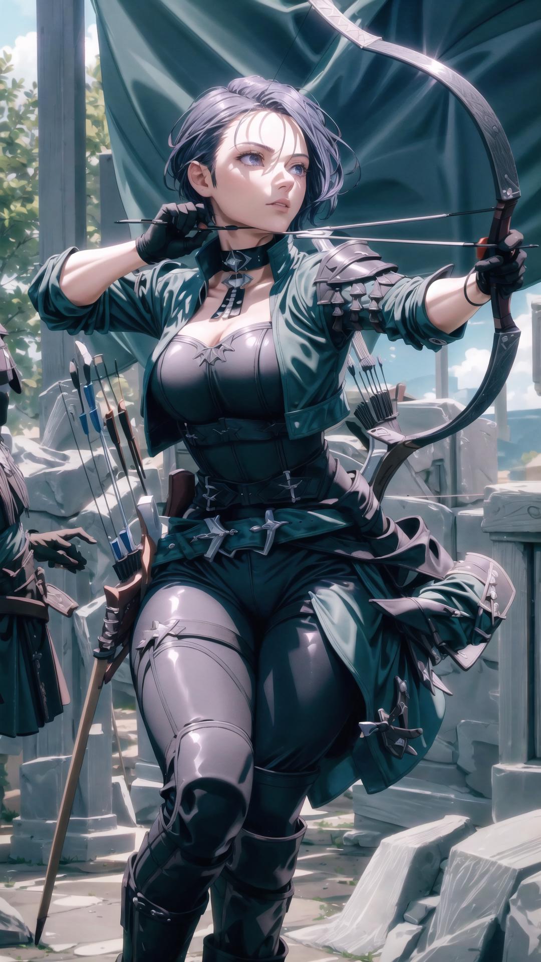 Add "defShamir, collar, shoulder pad, black shirt, black gloves, bodice, green jacket, green belt, black pants, green boots" for her regular appearance.