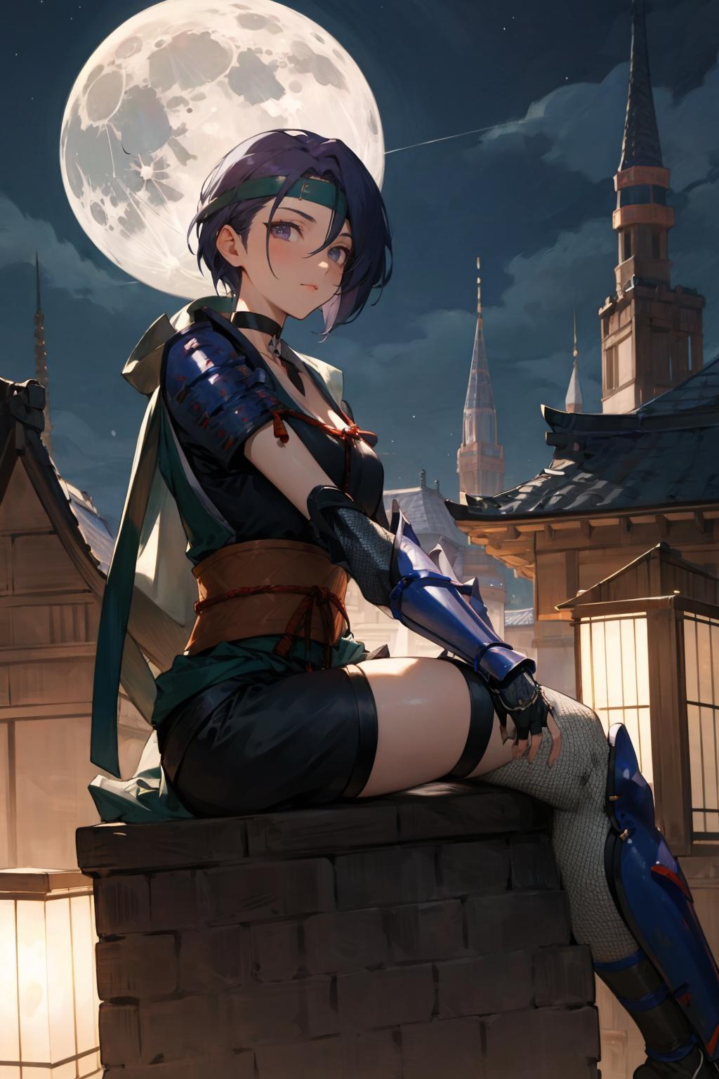 Add "ninShamir, headband, armor, choker, japanese clothes, sash, fingerless gloves, black shorts, fishnets, black thighhigh, sandals" for Ninja Shamir.