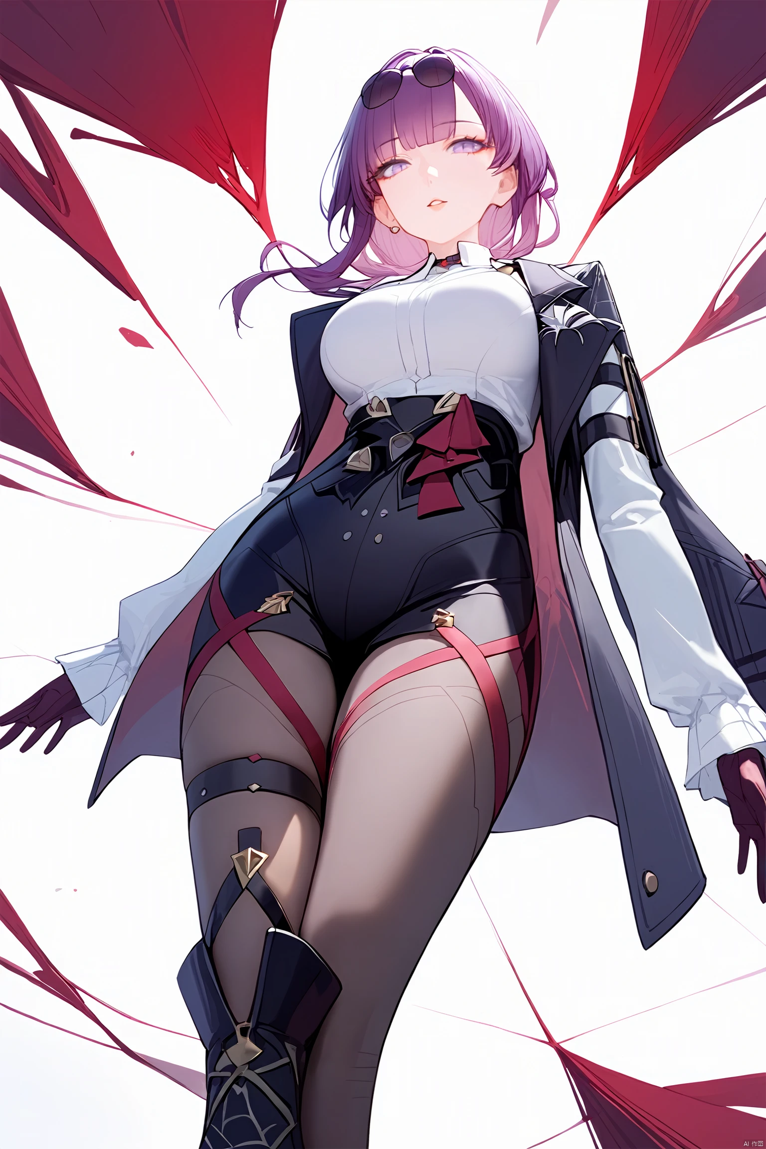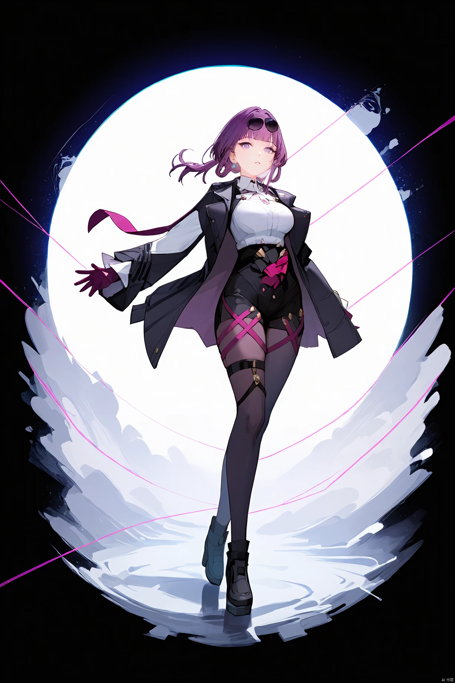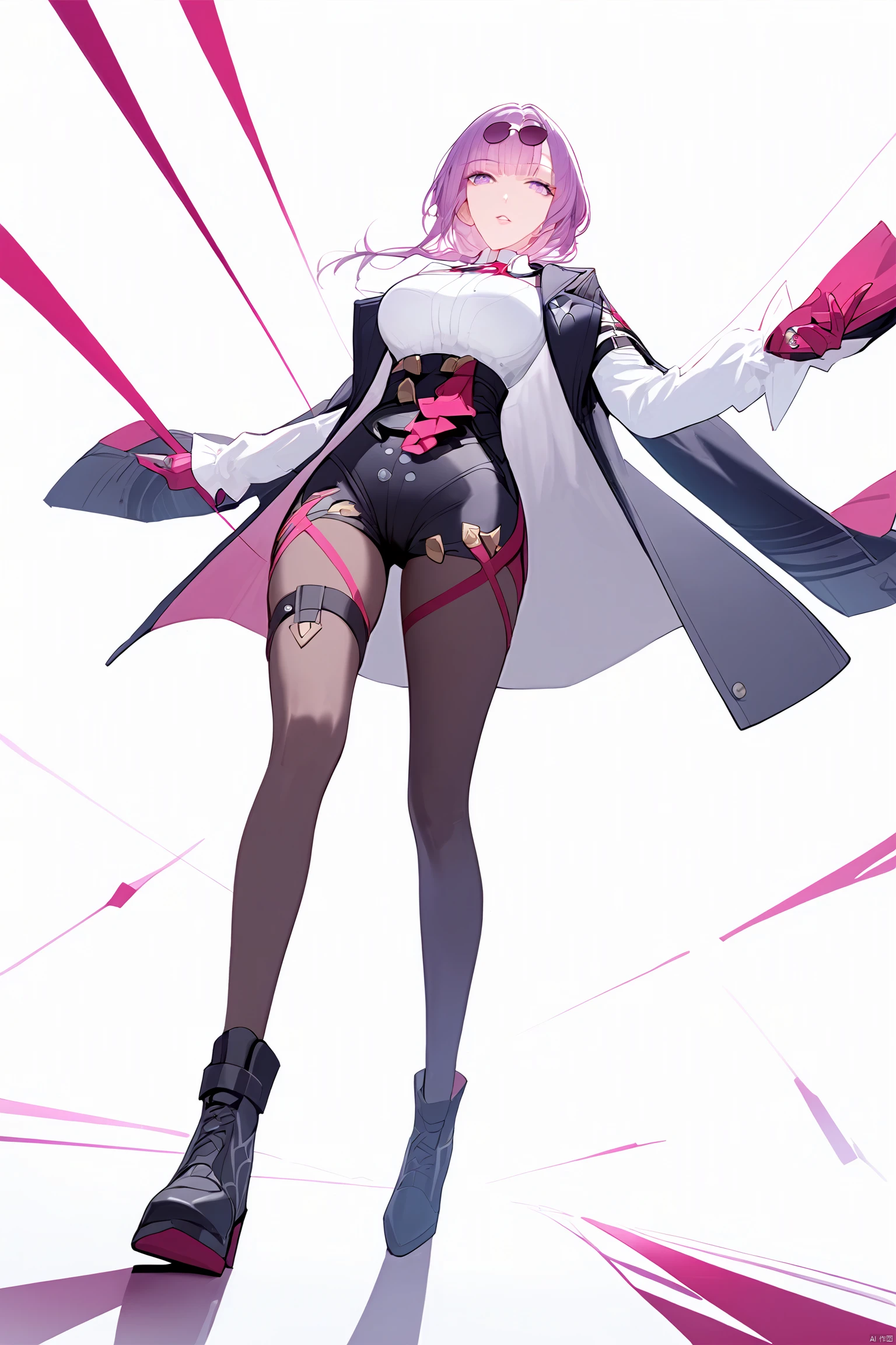 kafuka, 1girl, gloves, pantyhose, purple hair, sunglasses, eyewear on head, ?????????????, white shirt, black short, black footwear, boot,bangs, long sleeves, purple eyes,jacket,