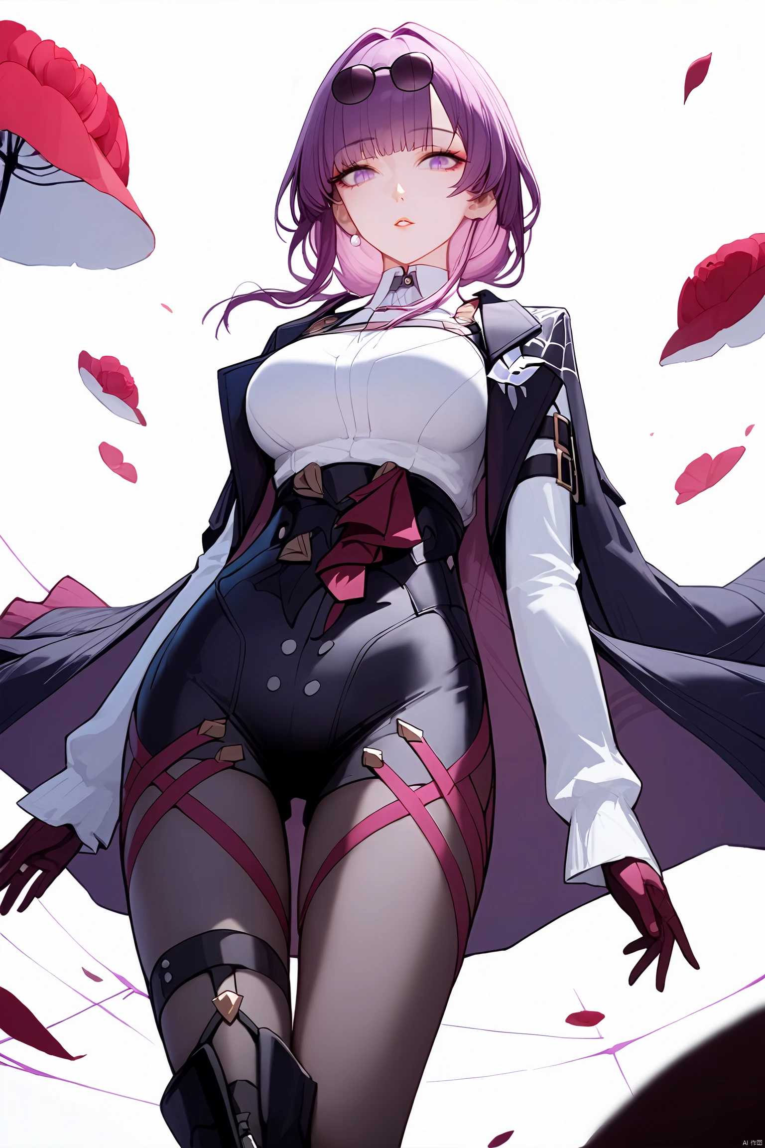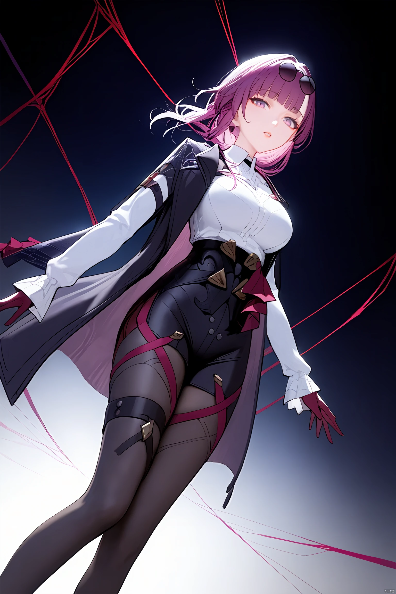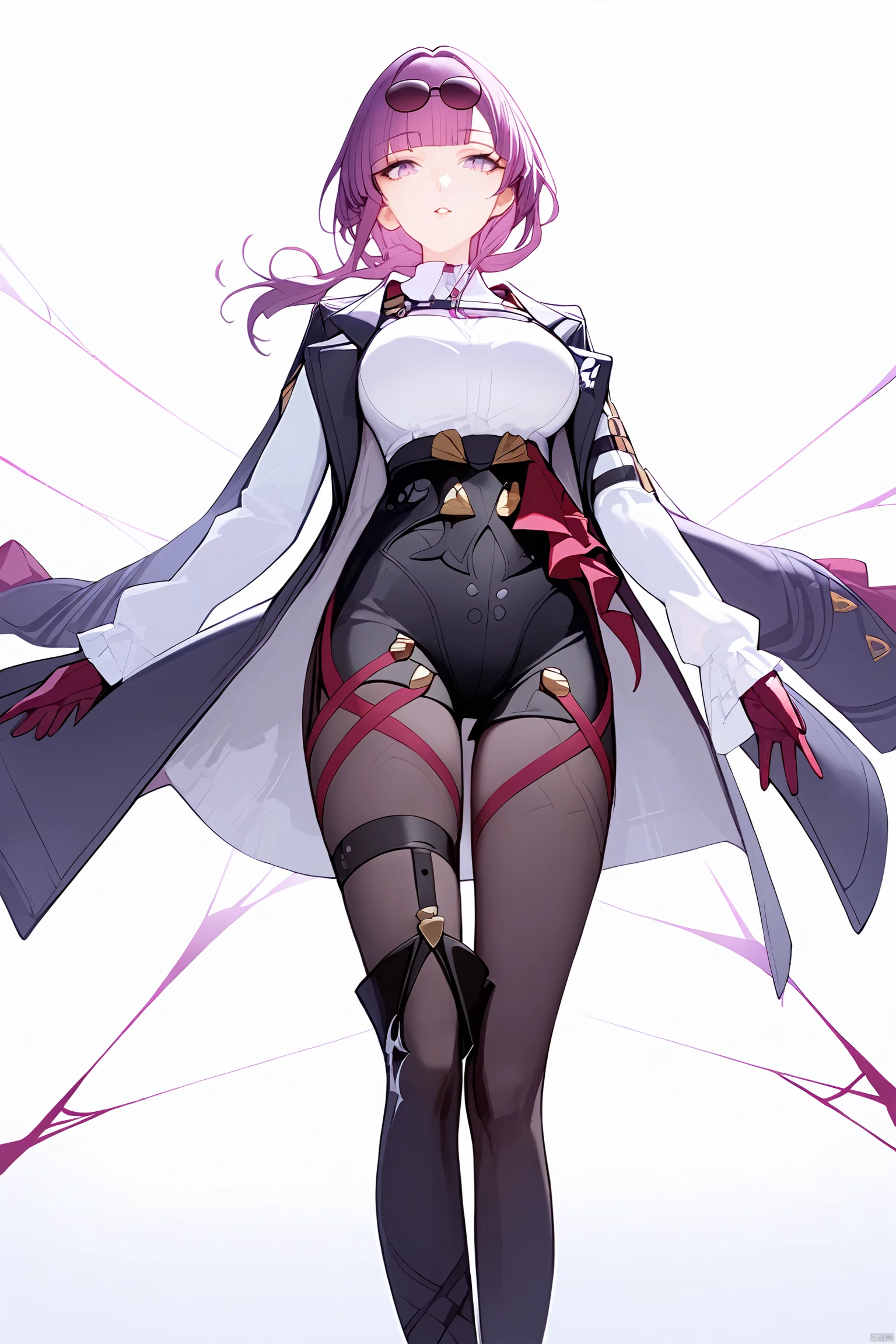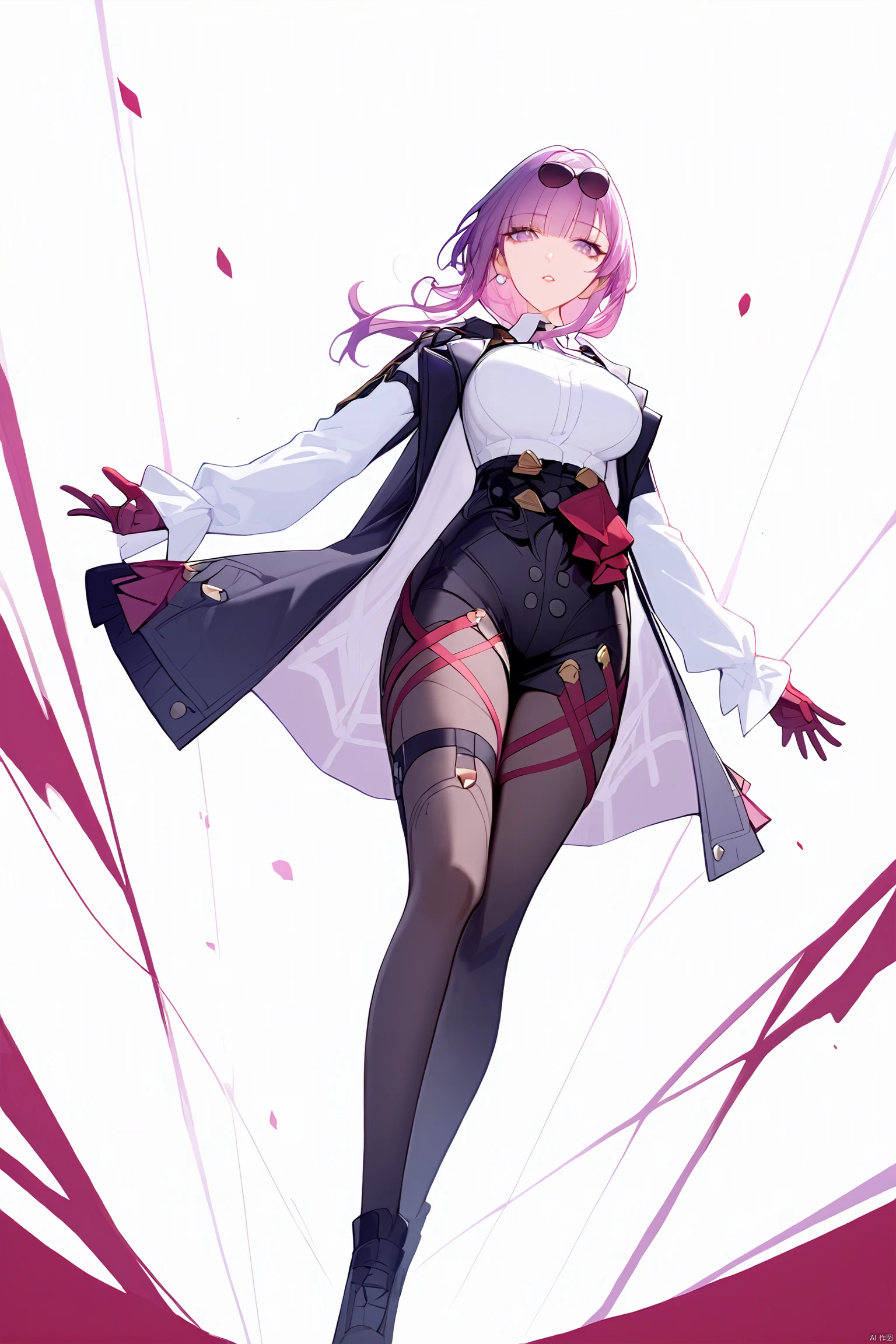 kafuka, 1girl, gloves, pantyhose, purple hair, sunglasses, eyewear on head, ?????????????, white shirt, black short, black footwear, boot,bangs, long sleeves, purple eyes,jacket,
