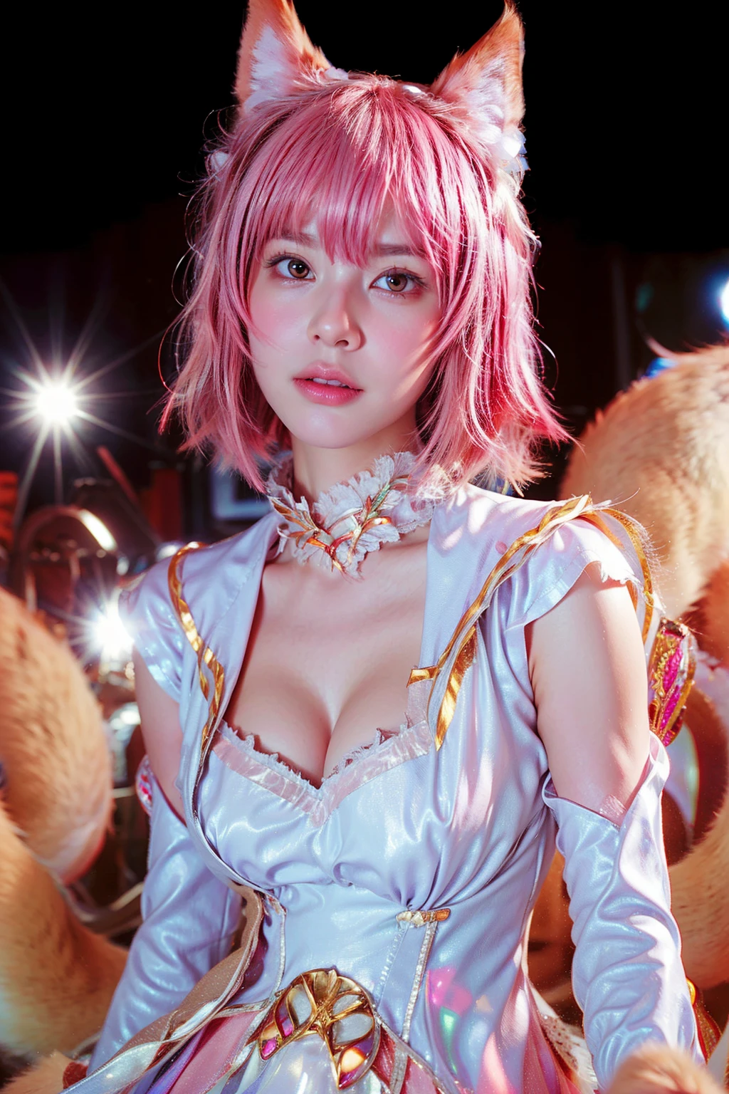 Idol Liliana sports a white and gold outfit paired with a lovely parasol. Her white tails have been dyed in a vivid gradient of yellow and orange. Both Ahri and Liliana show off their own versions of the heart sign in their splash arts.