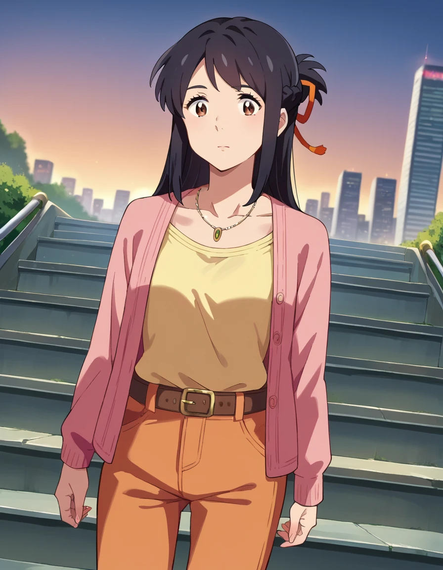 long hair, straight hair, braid, hair ribbon, cardigan, pink cardigan, shirt, yellow shirt, belt, pants, orange pants, necklace, collarbone,