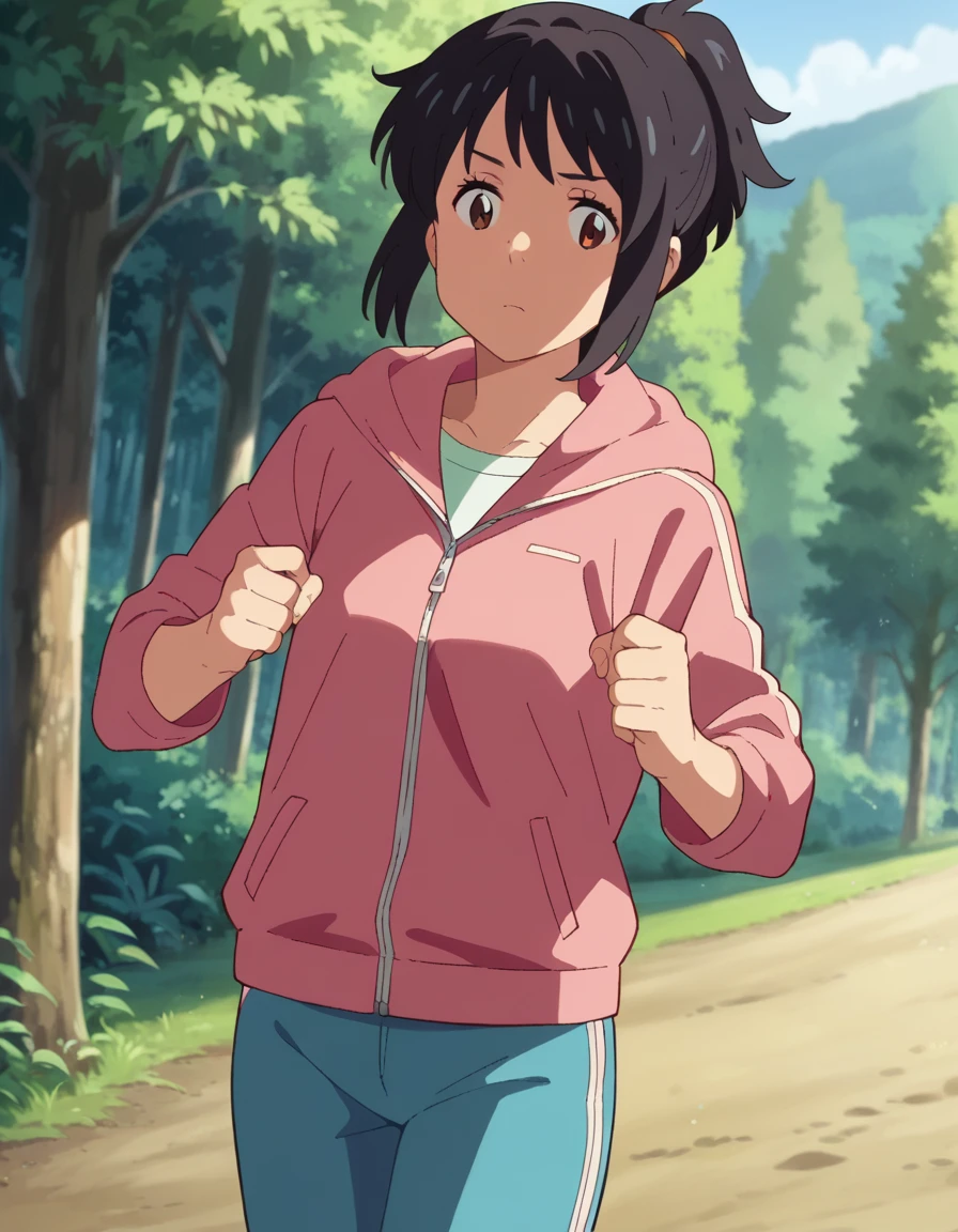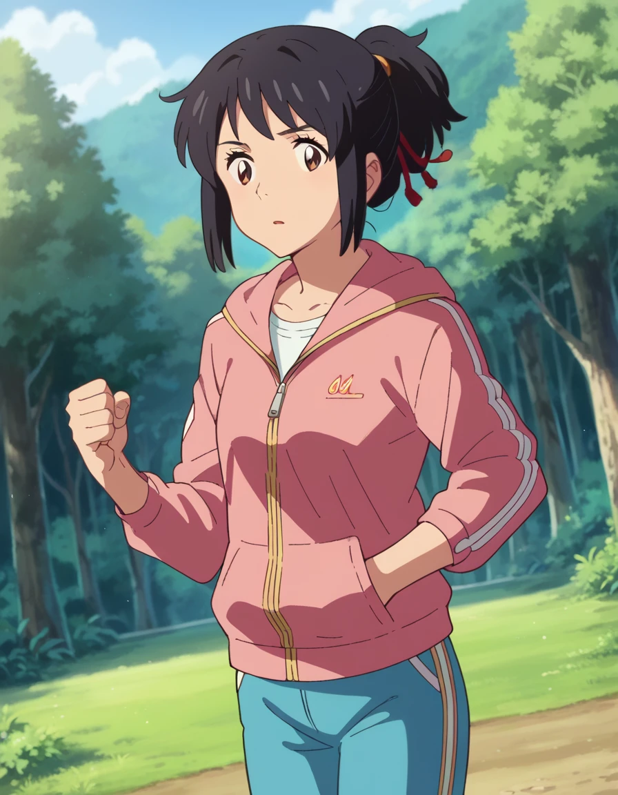 medium hair, ponytail, sidelocks, jacket, pink jacket, hoodie, zipper, track pants, blue pants, closed jacket,