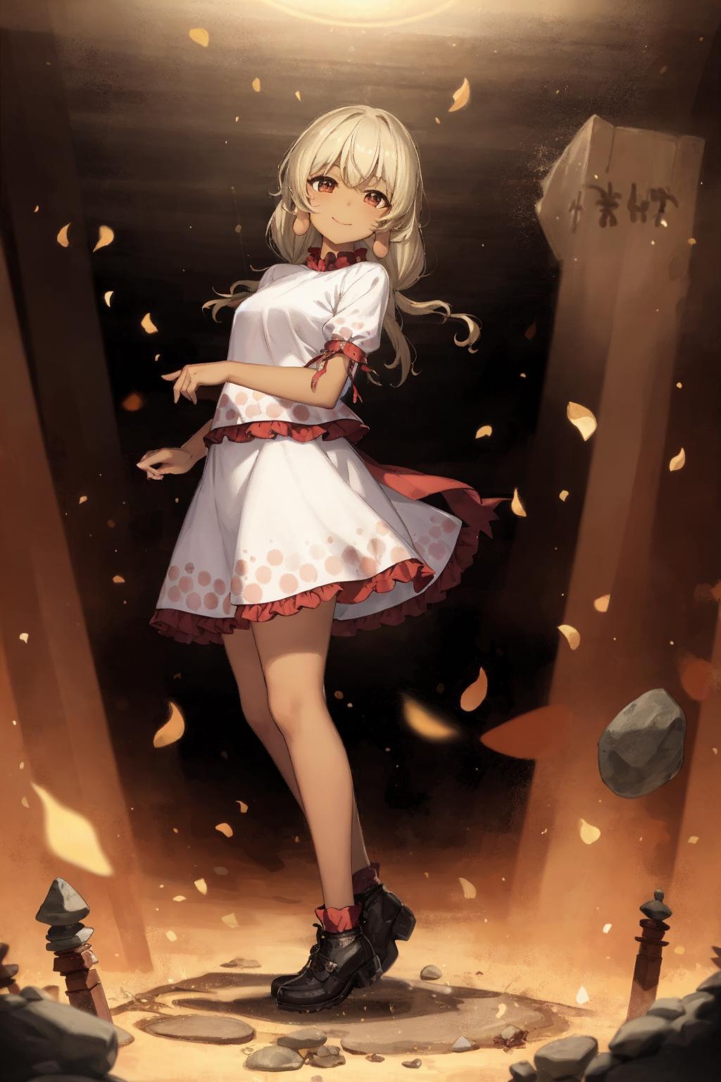 1girl,blonde hair,long hair,long earlobes,brown eyes,blouse,white shirt, frills skirt, white skirt, skirt set, dark skin,dark-skinned female,
