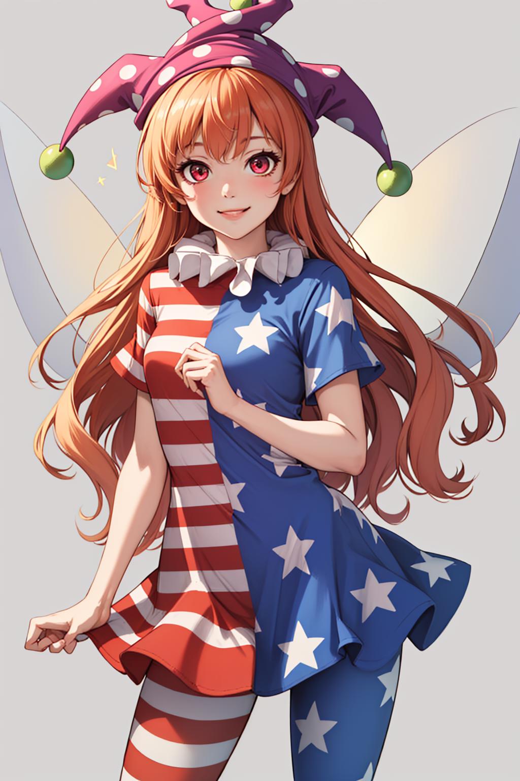 Default Outfit: jester cap, polka dot, american flag dress, neck ruff, short sleeves, american flag legwear, pantyhose, fairy wings, star \(symbol\)