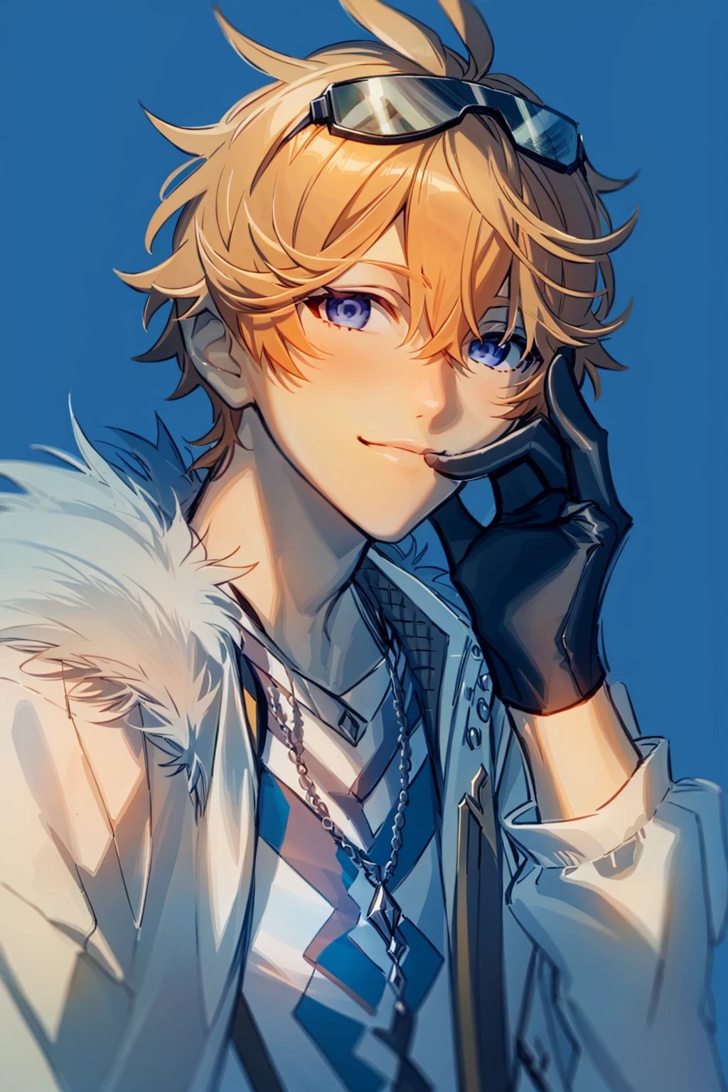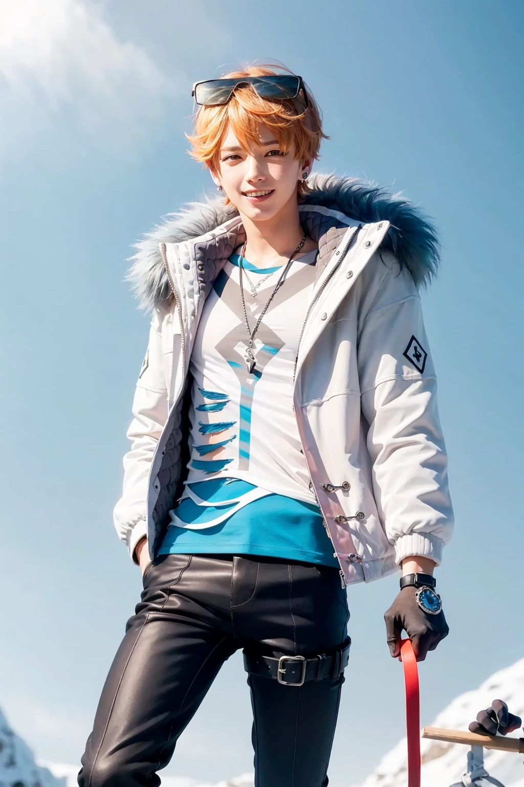 1boy,male focus,tartaglia \(genshin impact\),alternate costume, orange hair, short hair,blue eyes,earrings,dog tags,jewelry,gloves,fur trim,white shirt,,long sleeves, black pants,thigh strap,