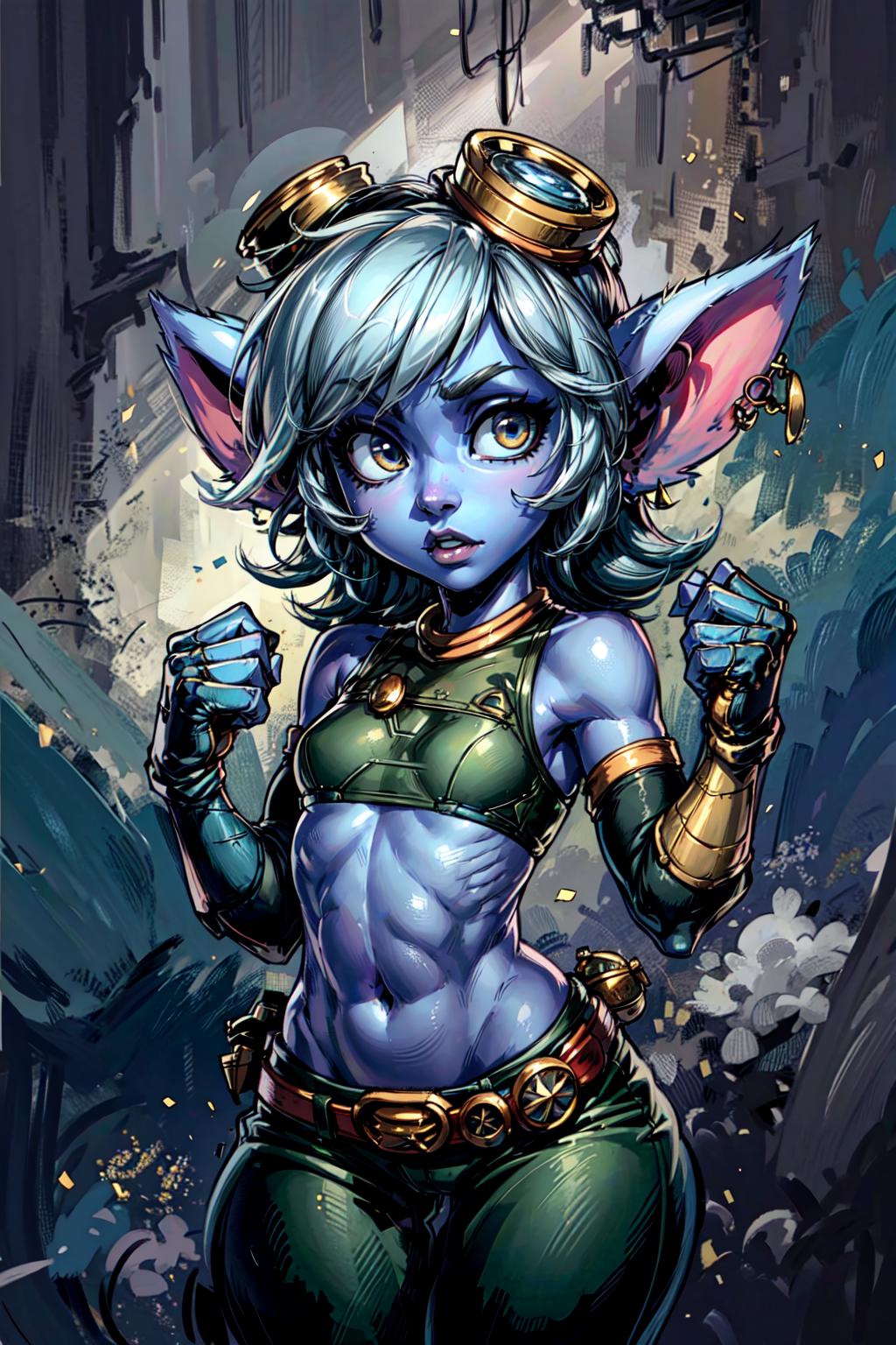 character prompt: Tristana \(league of legends\), league of legends, goggles, goggles on head, gloves, navel, jewelry, earrings, fingerless gloves, elbow gloves, belt, green pants, crop top arm sleeves, grenade belt, toeless legwear, (blue skin:1.2), <lora:TristanaFinal:0.7>,