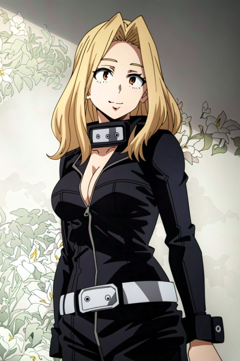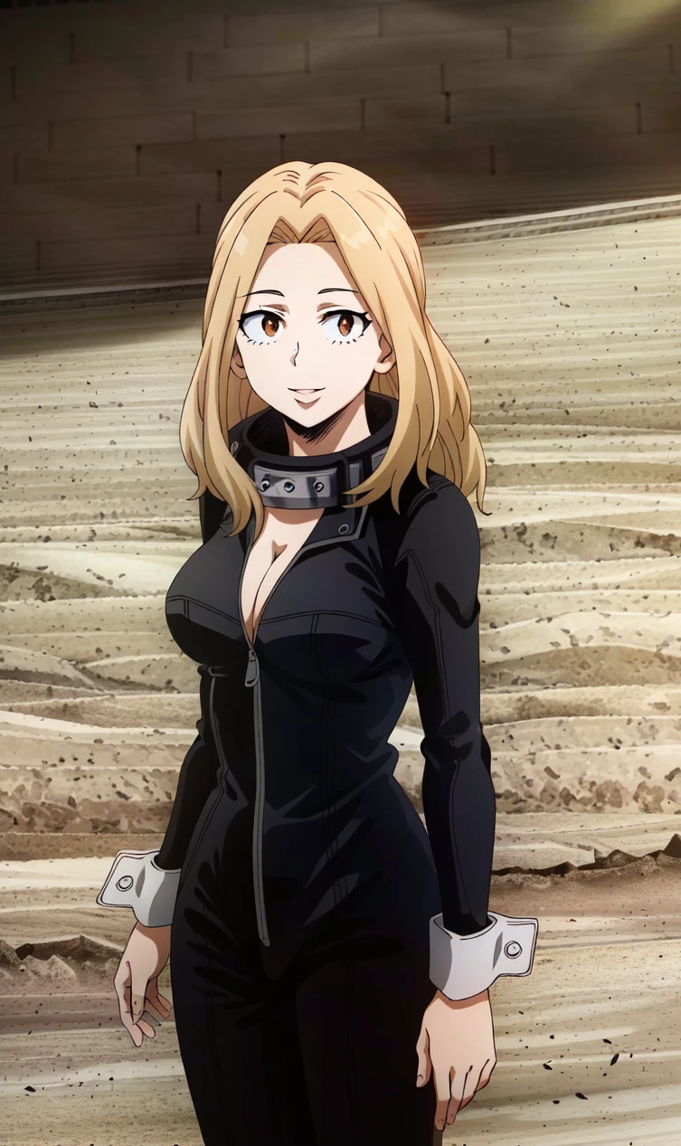 amie Utsushimi, 1girl, solo, ???????, hat, ????????, cleavage, boots, full body, hand on hip, peaked cap, white background, black ????????, ?????????????, standing, one eye closed, blonde hair, simple background, looking at viewer, long hair, white footwear, unzipped, smile, wrist cuffs, brown eyes, knee boots, shadow, zipper