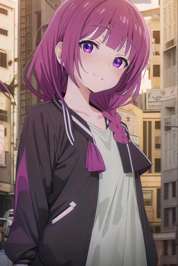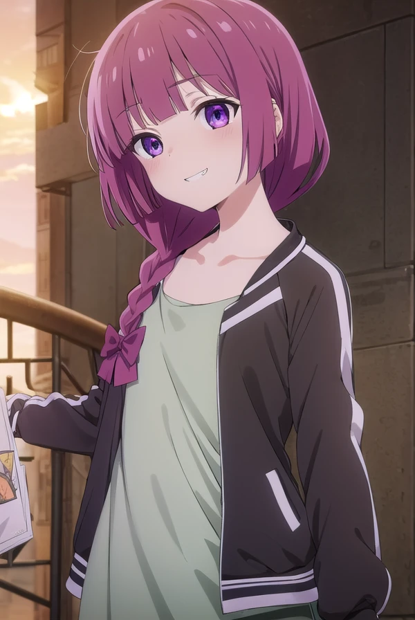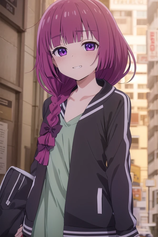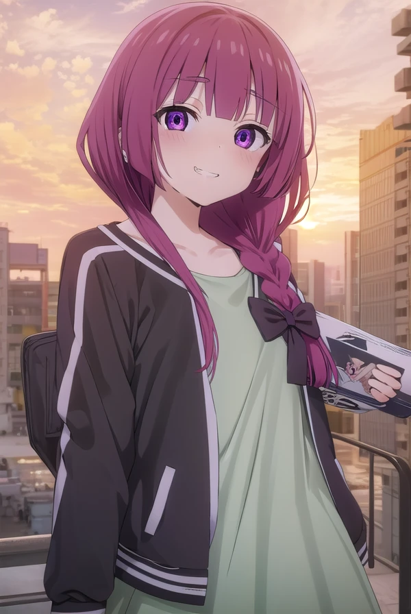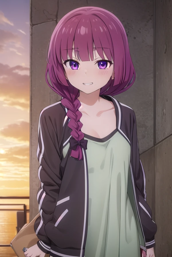 kikuri hiroi, black bow, blunt bangs, braid, closed eyes, fang, hair bow, hair over shoulder, long hair, purple hair, sidelocks, single braid, purple eyes,