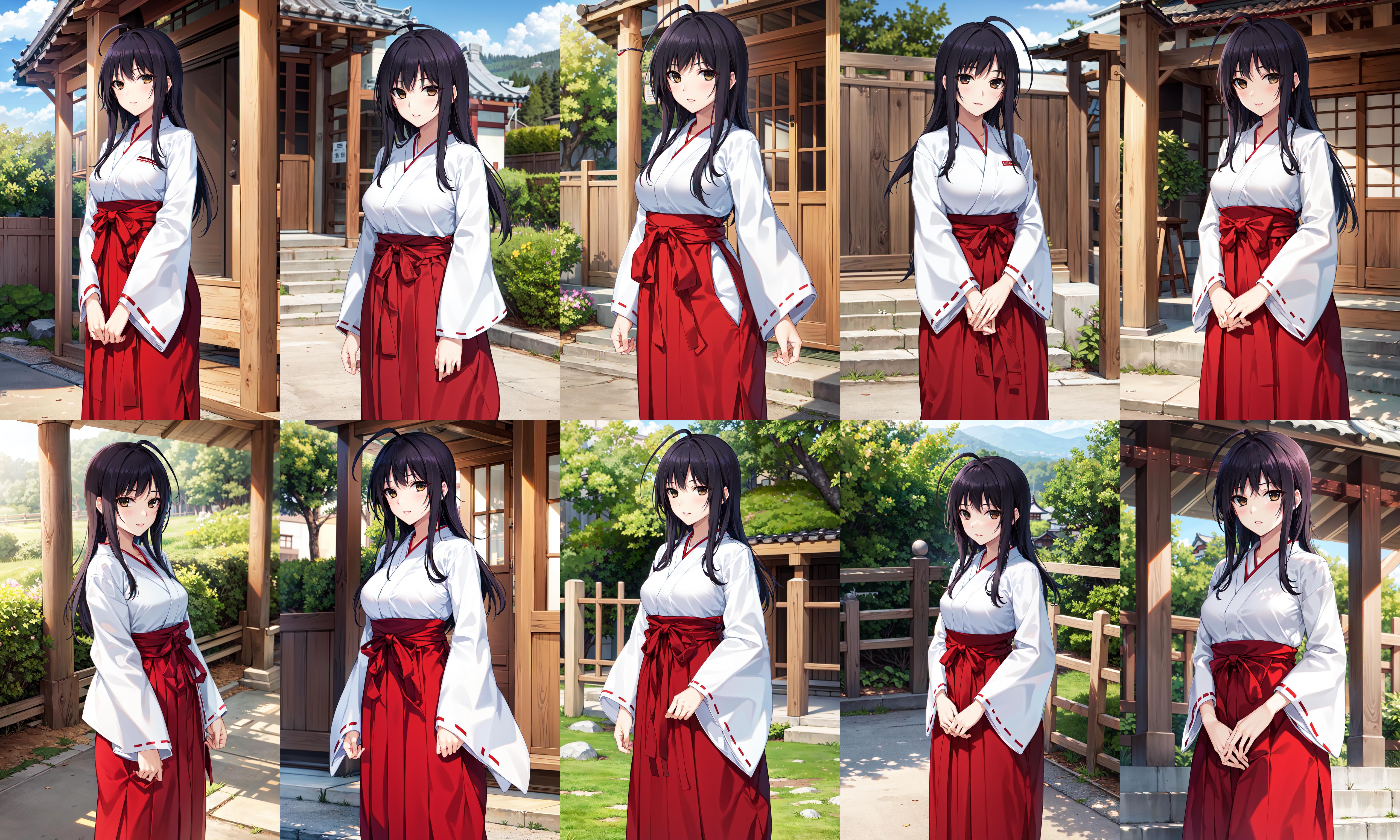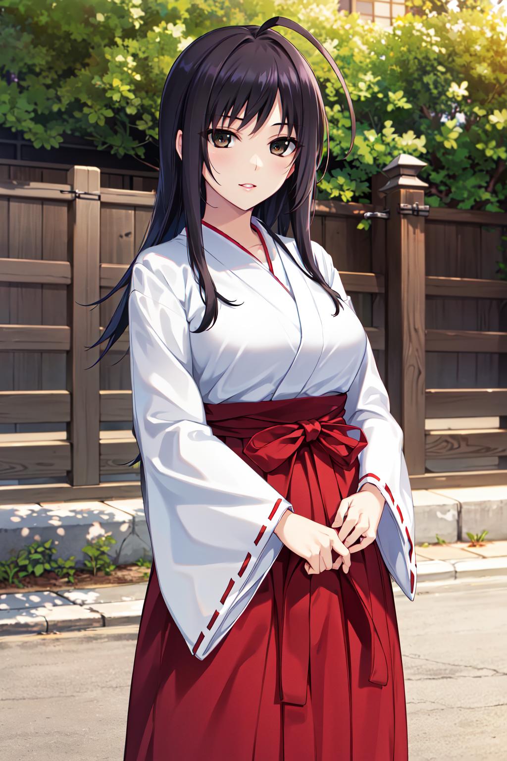 outfitaawakoto, long hair, ahoge, miko, japanese clothes, hakama, red skirt
