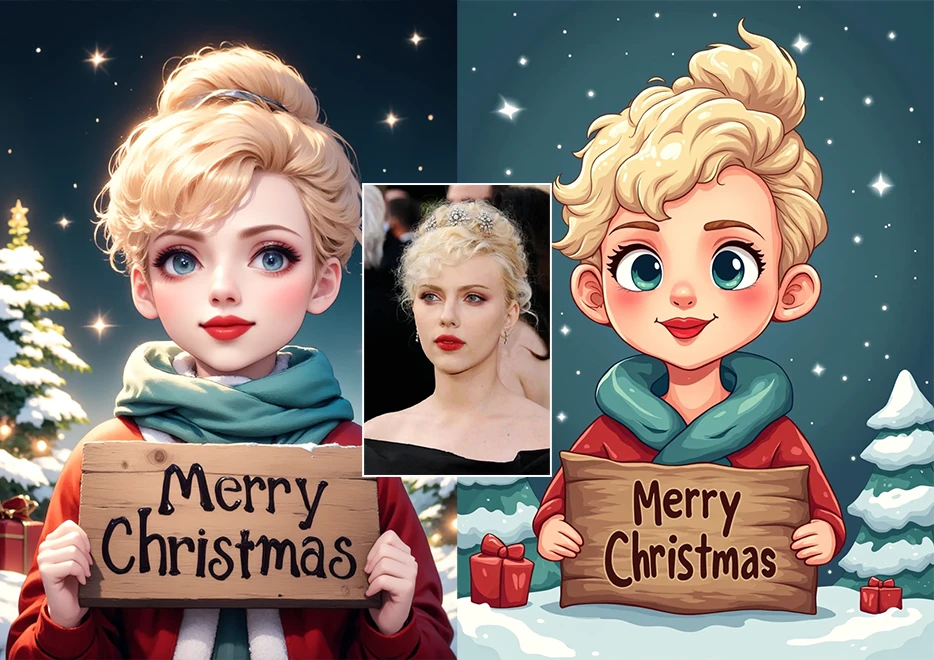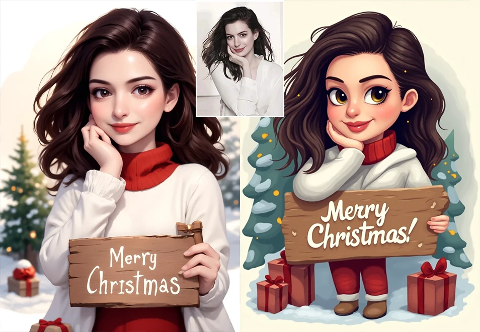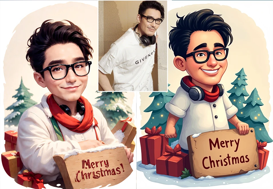 Nur 1 Foto hochladen,um 2 Weihnachts-Cartoon-Bilder zu erstellen,Nach meinen Tests,Eine Halbkörperaufnahme funktioniert am besten