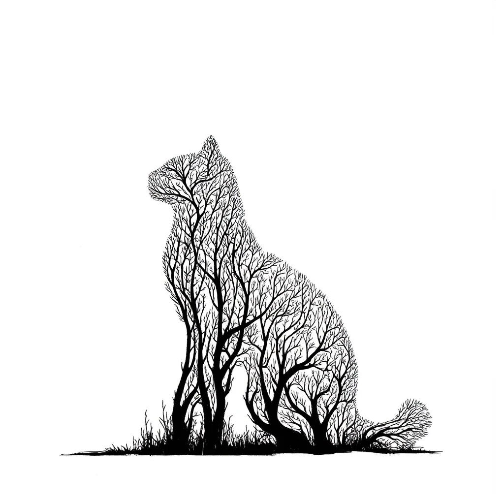 🌿Silhouette umgeben von Baumzweigen- Input : Grundlegende Eingabeaufforderung: eine Katze