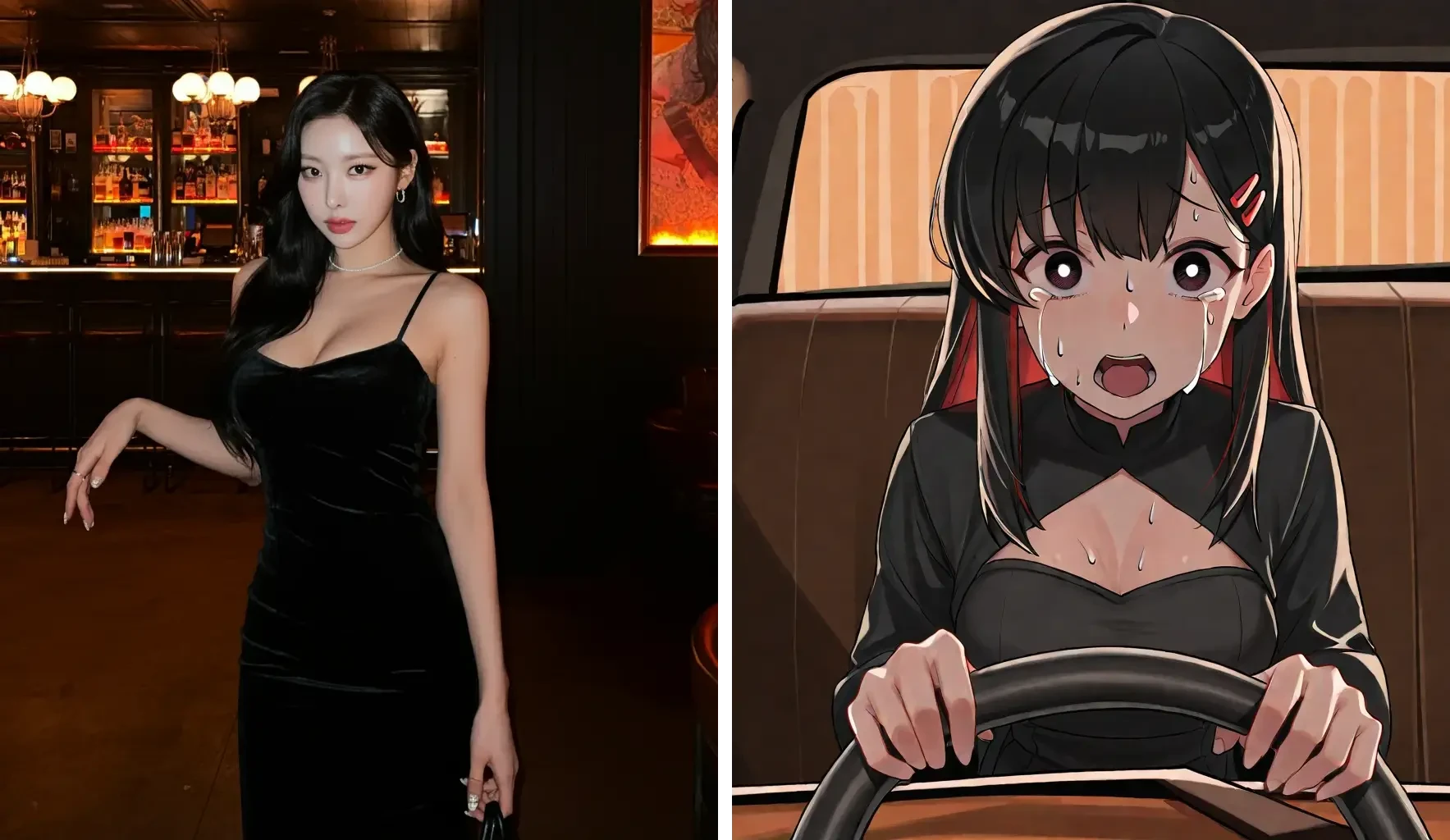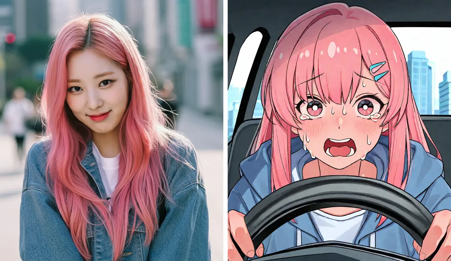 Ein kreativer Generator, der Bilder in Charaktere verwandelt und auf humorvolle Weise den Moment kurz vor einem Autounfall darstellt.