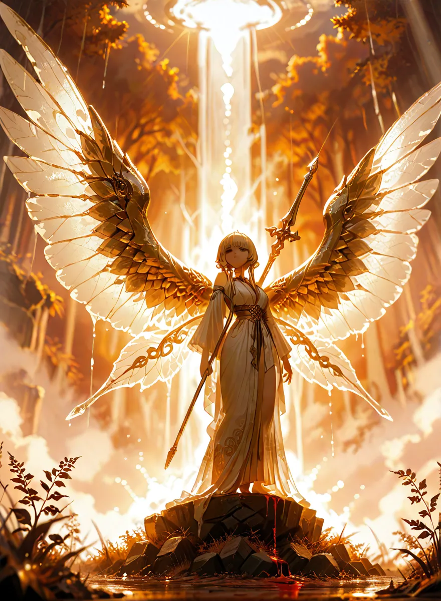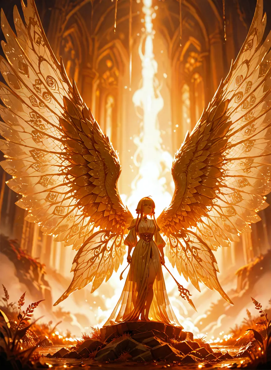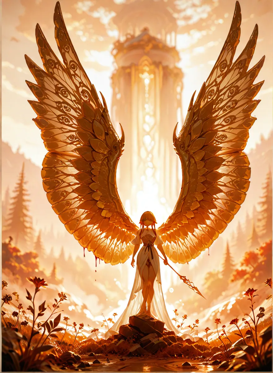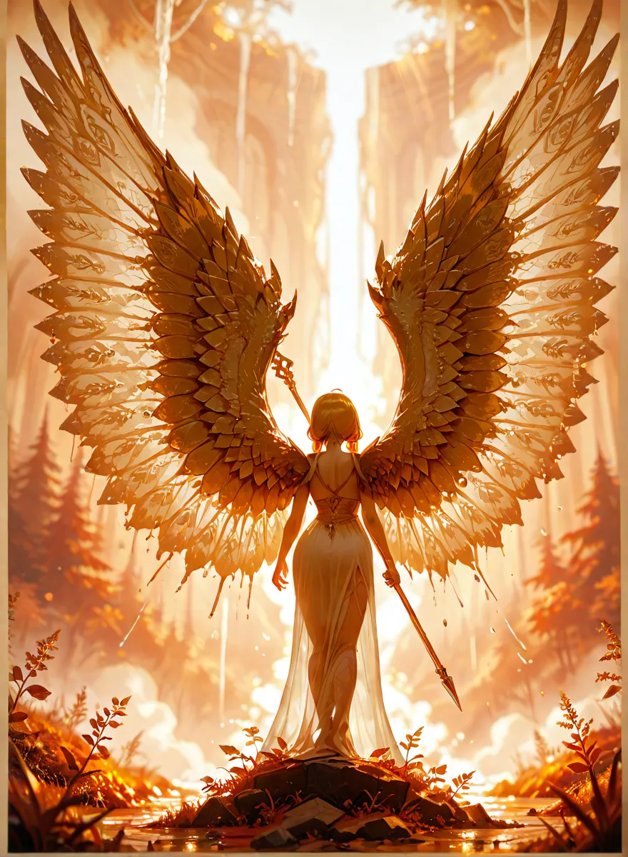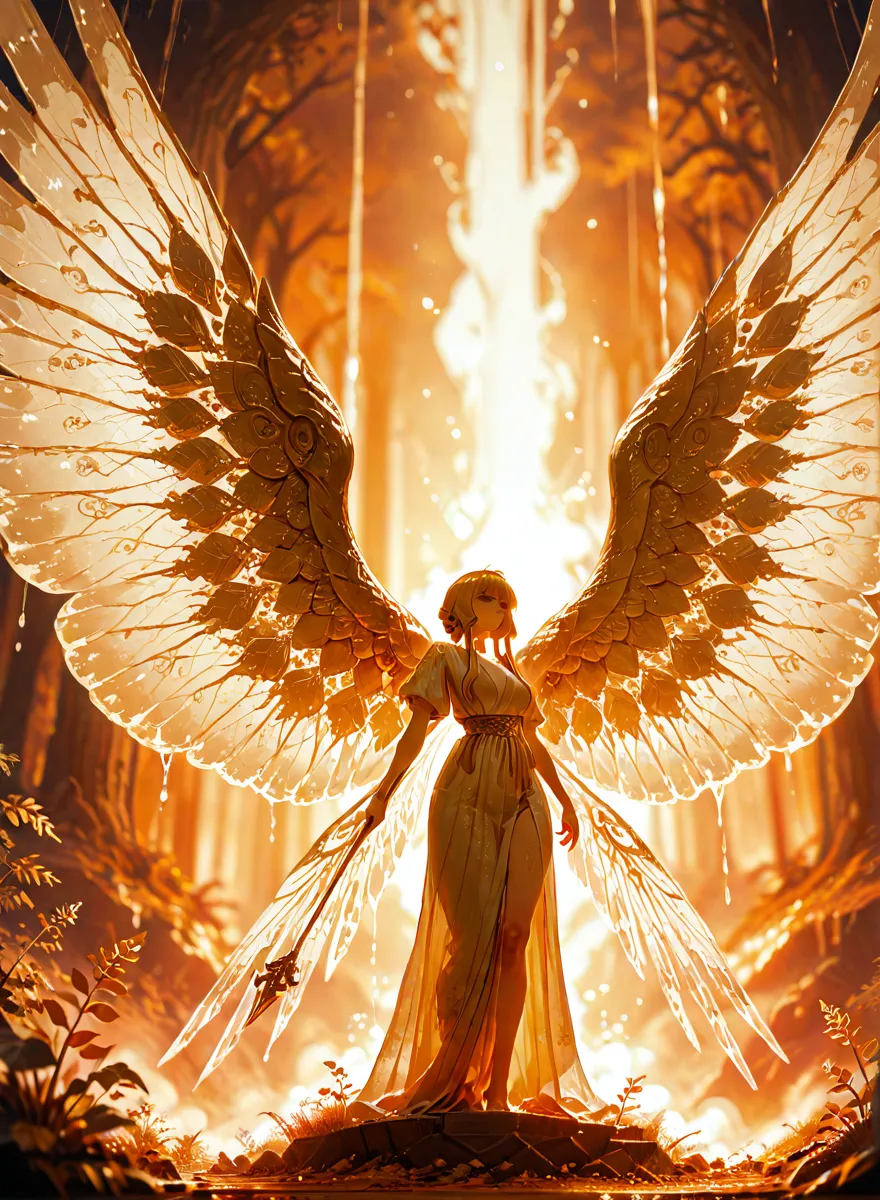 Illustrious/großartige Komposition: Die Wächterin würde den Vordergrund dominieren, ihre riesigen Flügel breiten sich aus, vermittelt ein Gefühl von immenser Macht und Majestät. Der Wald selbst würde sich in die Ferne erstrecken, erscheint antik und gewaltig, betont den epischen Maßstab. Die gesamte Komposition würde den Blick direkt auf die zentrale Figur und ihr strahlendes Licht lenken.