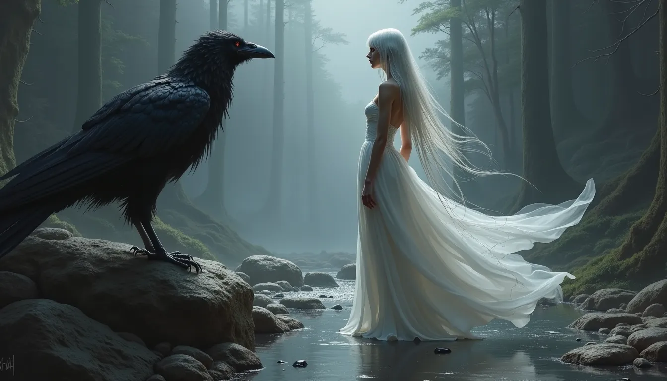 Frau mit silbernen Haaren in einem verschneiten Wald