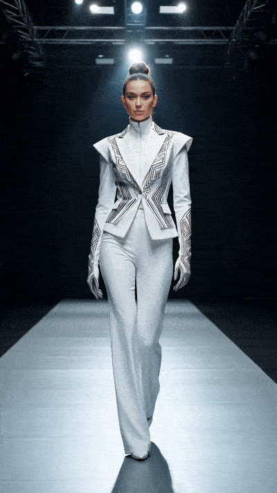 In einer surrealen Laufsteginszenierung, verwandeln sich die Körper der Models in Schmetterlingsflügel, Blütenblätter, und strahlende Partikel - die Verschmelzung von Fantasieelementen, um die ultimative Schönheit der körperlichen Metamorphose zu präsentieren.