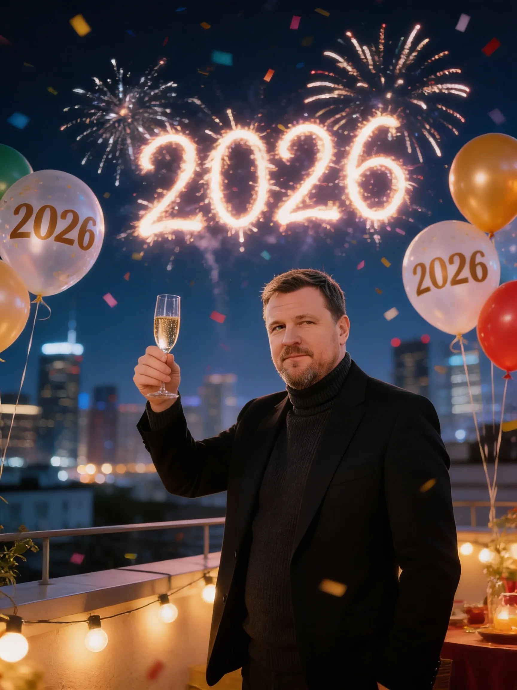 Dieser Filter verwandelt Fotos in festliche 2026-Szenen. Im Gegensatz zum KI-Neujahrs-Generator, der Texteingaben benötigt, reicht hier das Hochladen eines Fotos - keine Prompts oder Einstellungen nötig. Die KI fügt automatisch Champagner-Anstöße, Feuerwerk und Partyballons hinzu.