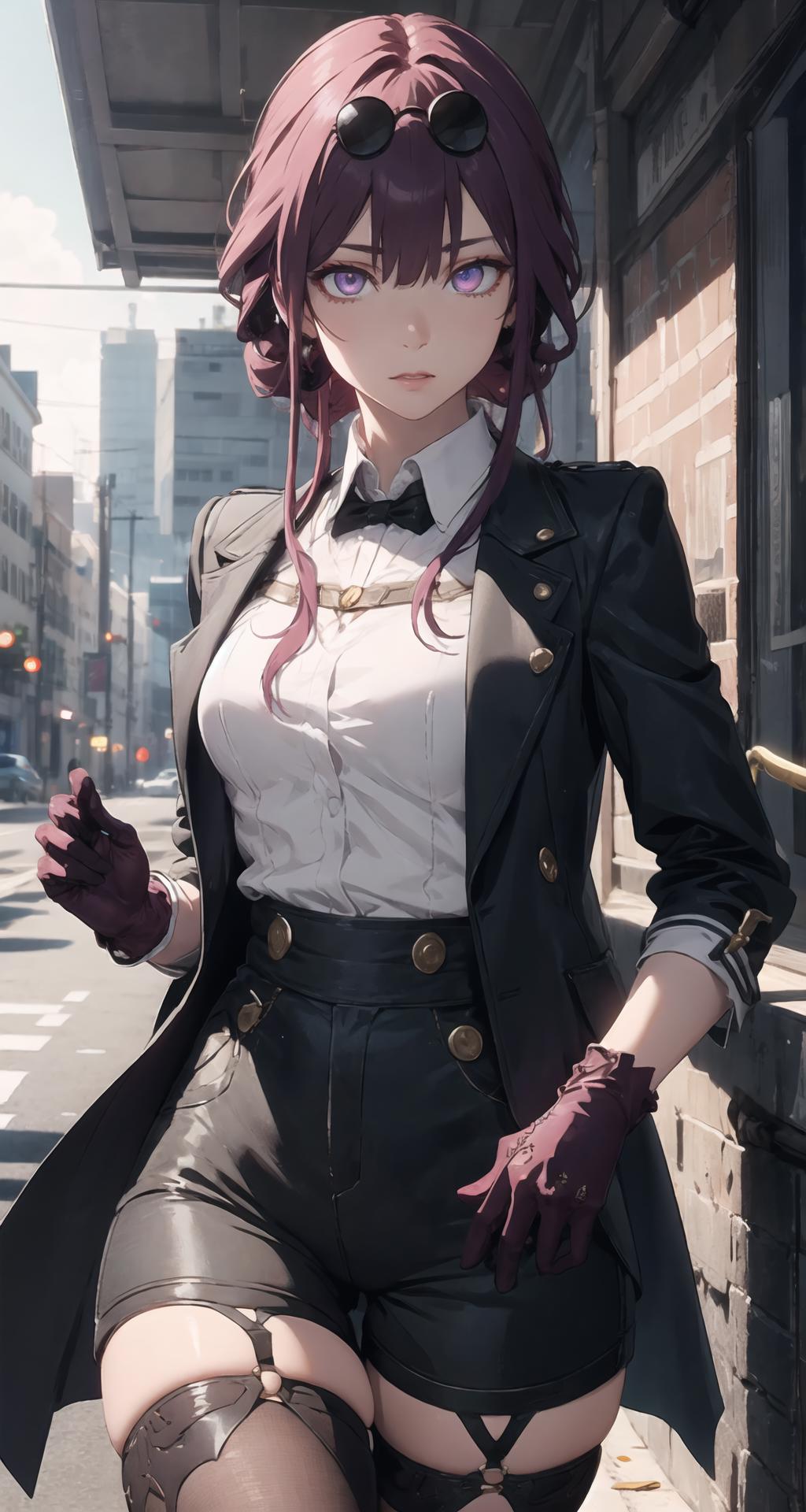 kafka, (eyewear on head:1.3), round eyewear, (purple eyes:1.1), purple hair, long hair,