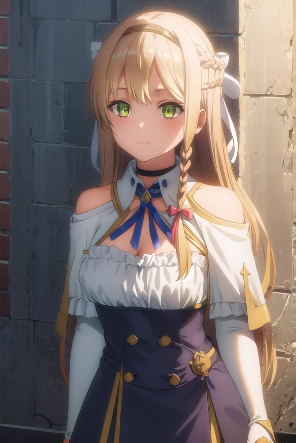 klaudia valentz, long hair, blonde hair, bow, ribbon, (green eyes:1.3), braid, hairband, side braid,