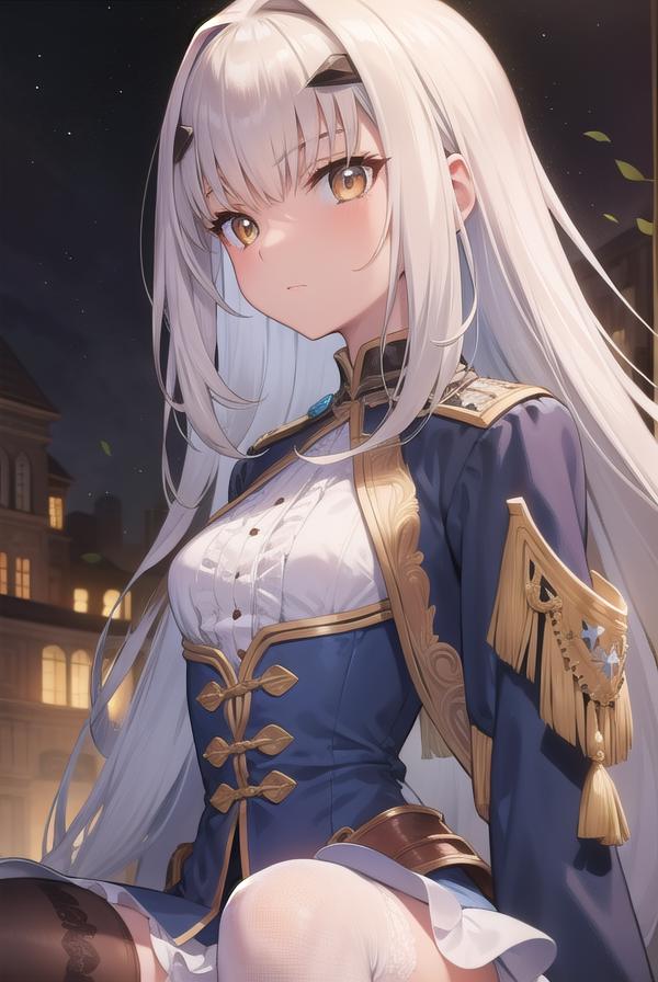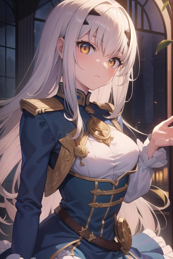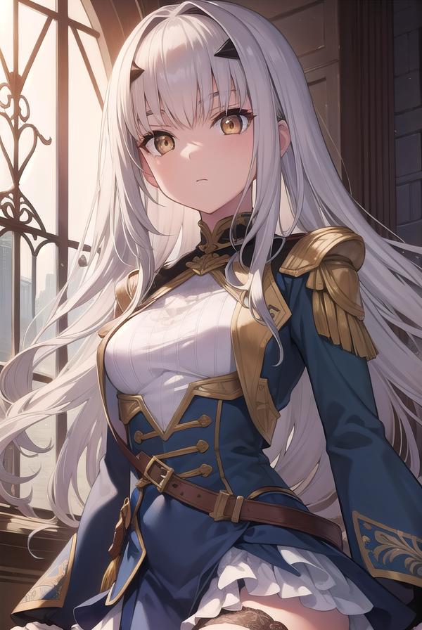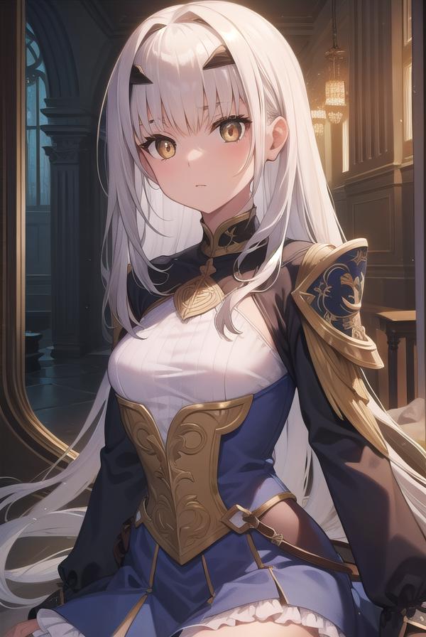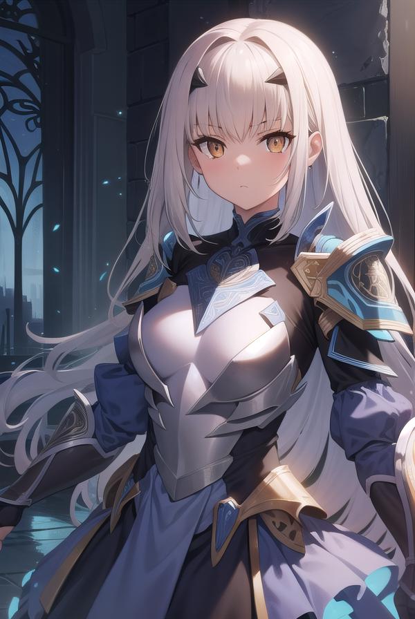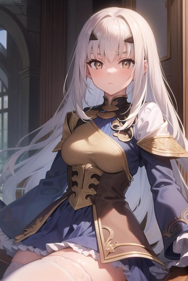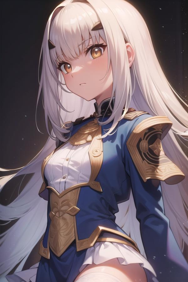 melusine, (brown eyes:1.5), long hair, white hair, sidelocks,