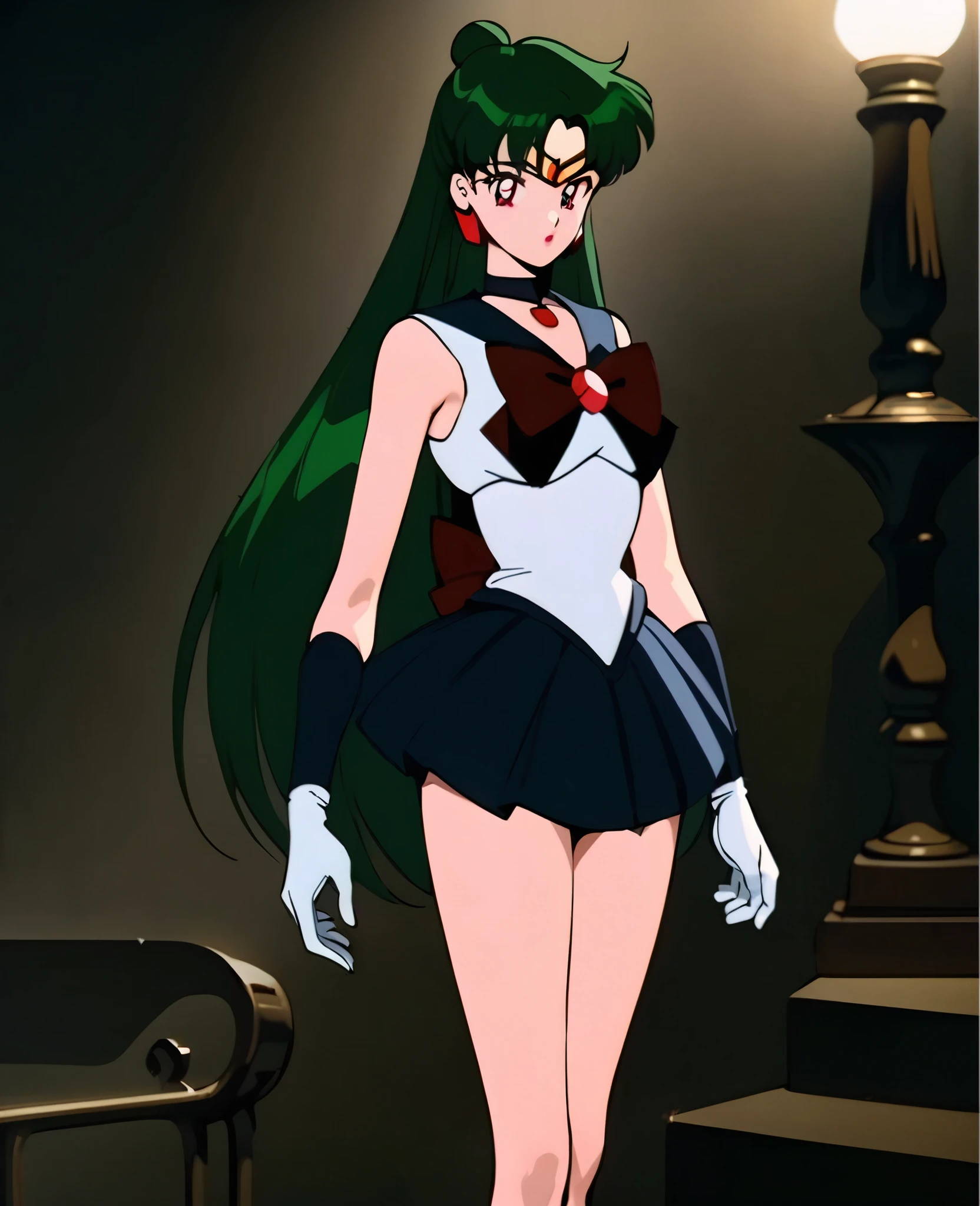 Sailor Pluto XL,sailor senshi uniform,lipstick,carmine eyes,hair bun,single hair bun,gloves,choker,skirt,long hair,dark green hair,elbow gloves,white gloves,jewelry,earrings,black choker,tiara,bow,black skirt,bare legs,