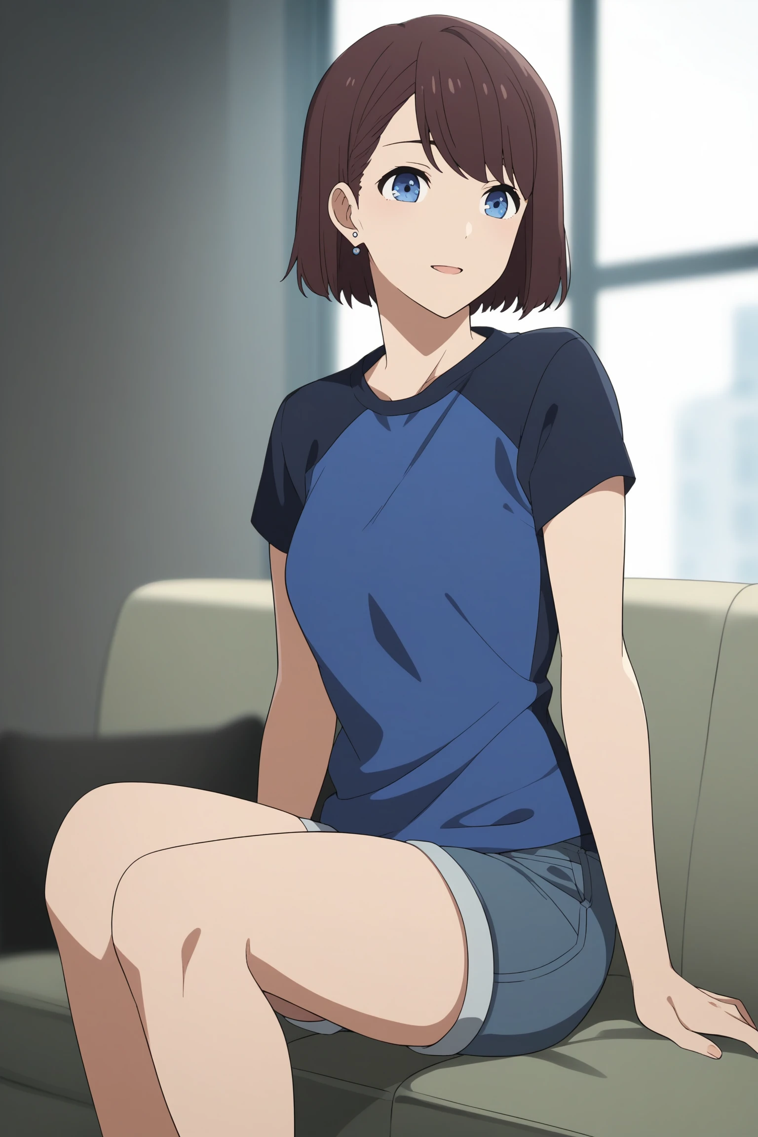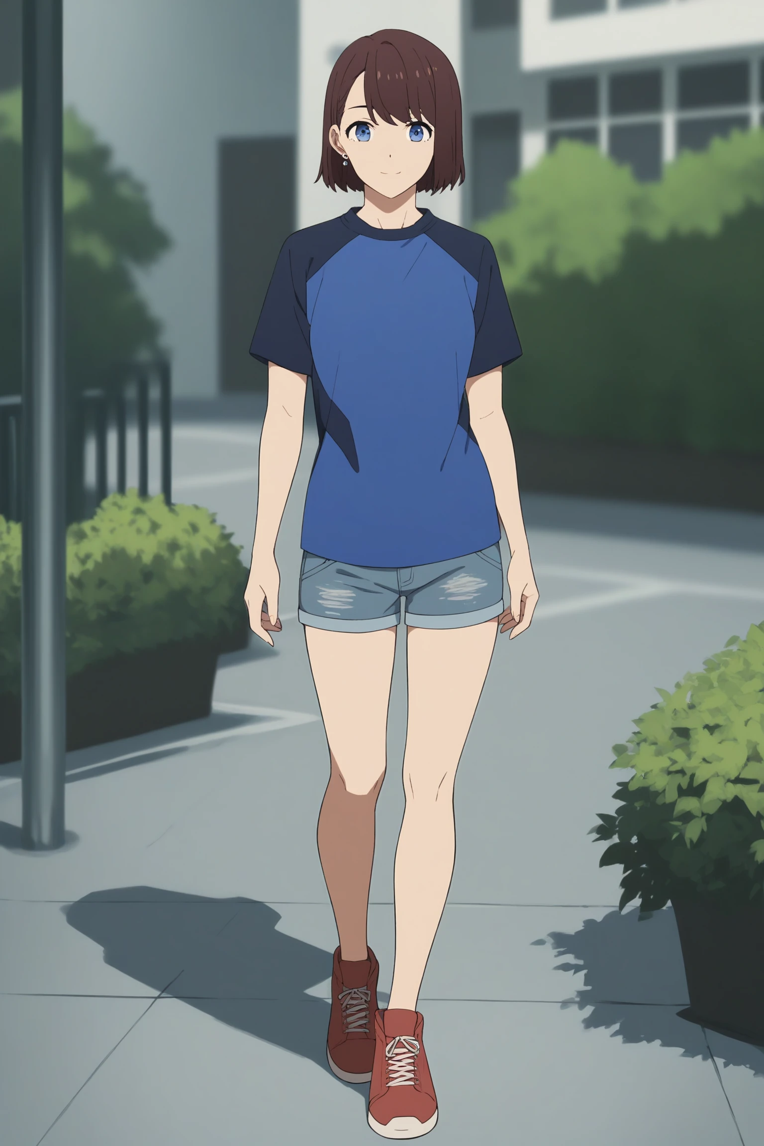 ninomiya mai, brown hair, short hair, blue eyes, earrings, t-shirt, blue shirt, shorts, denim, red sneakers