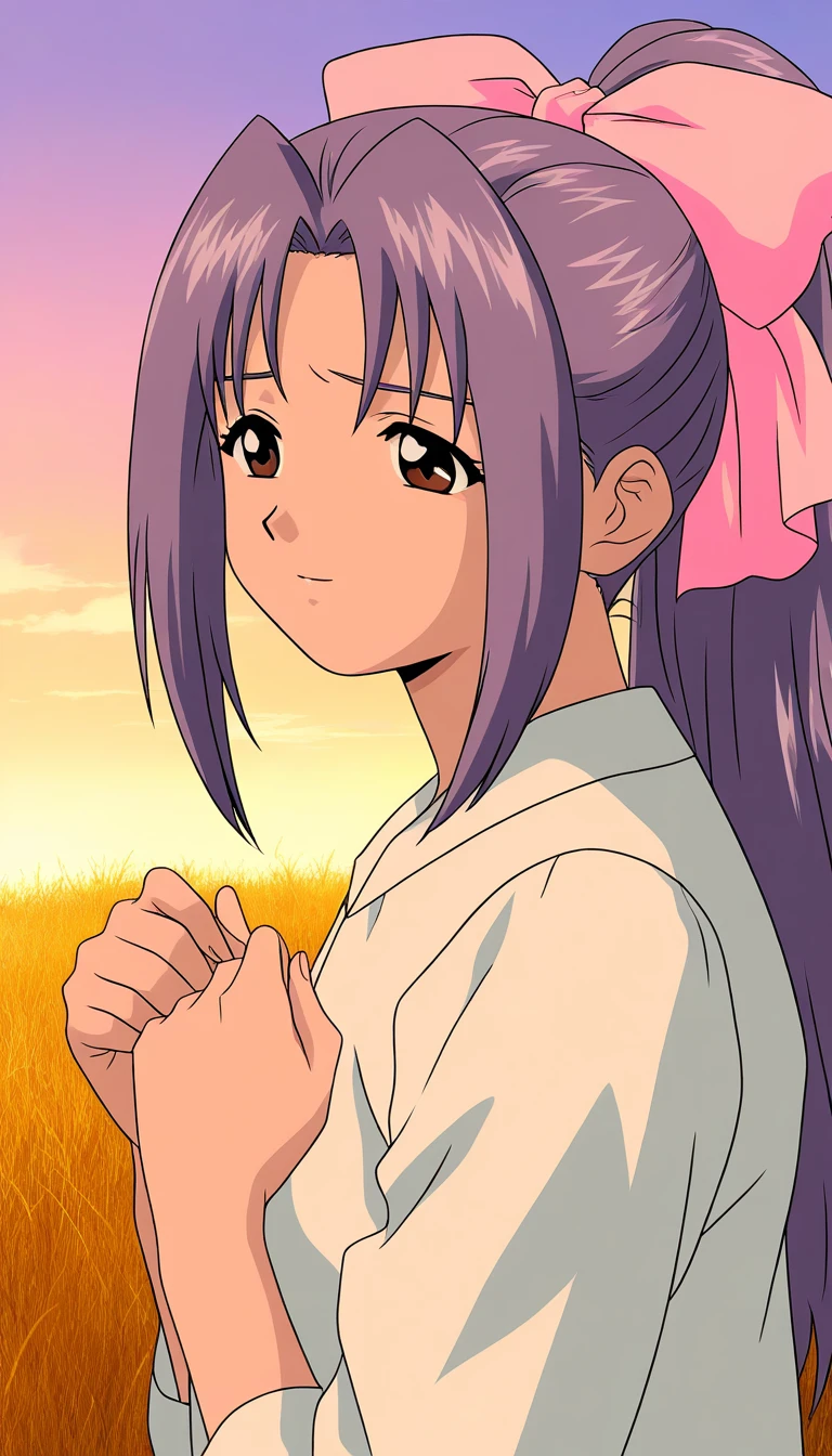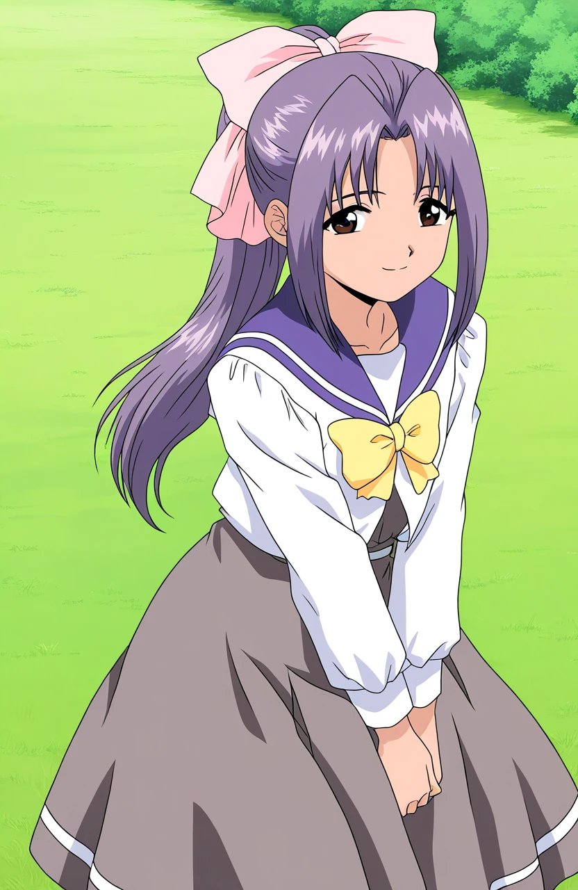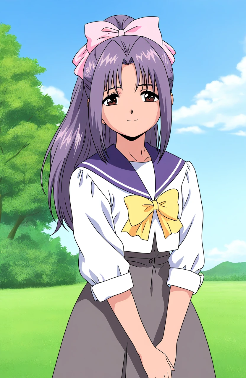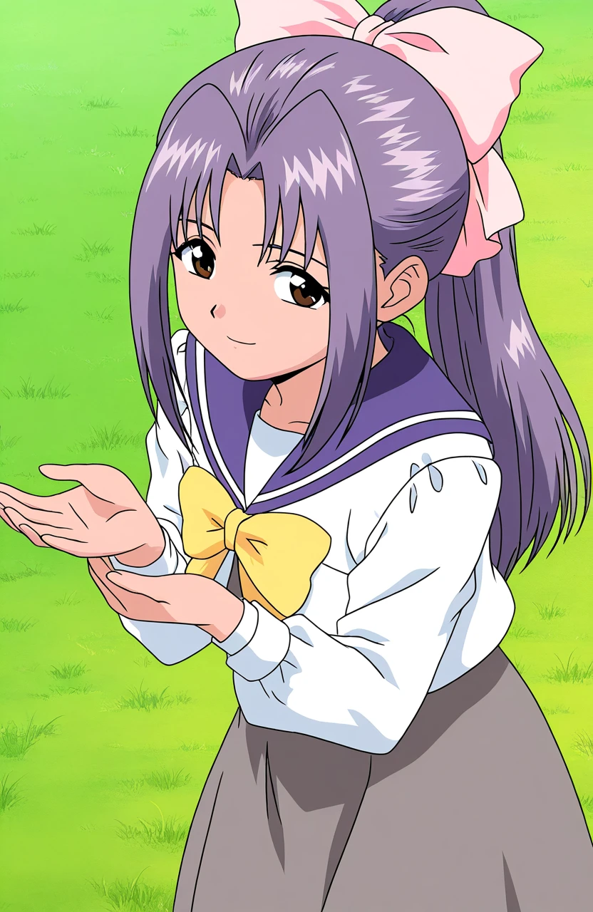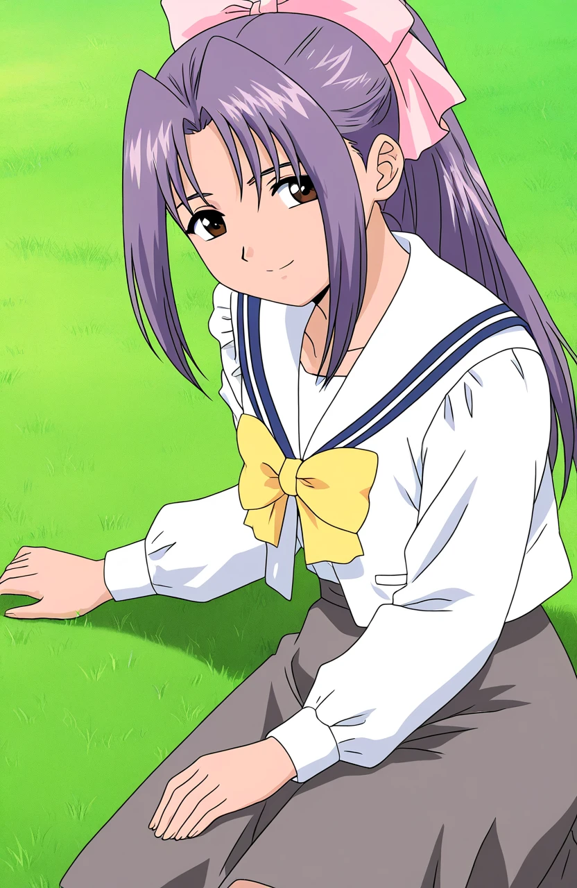 koigakubo_Momoko, purple hair, long hair, hair bow, brown eyes, ponytail, pink bow,