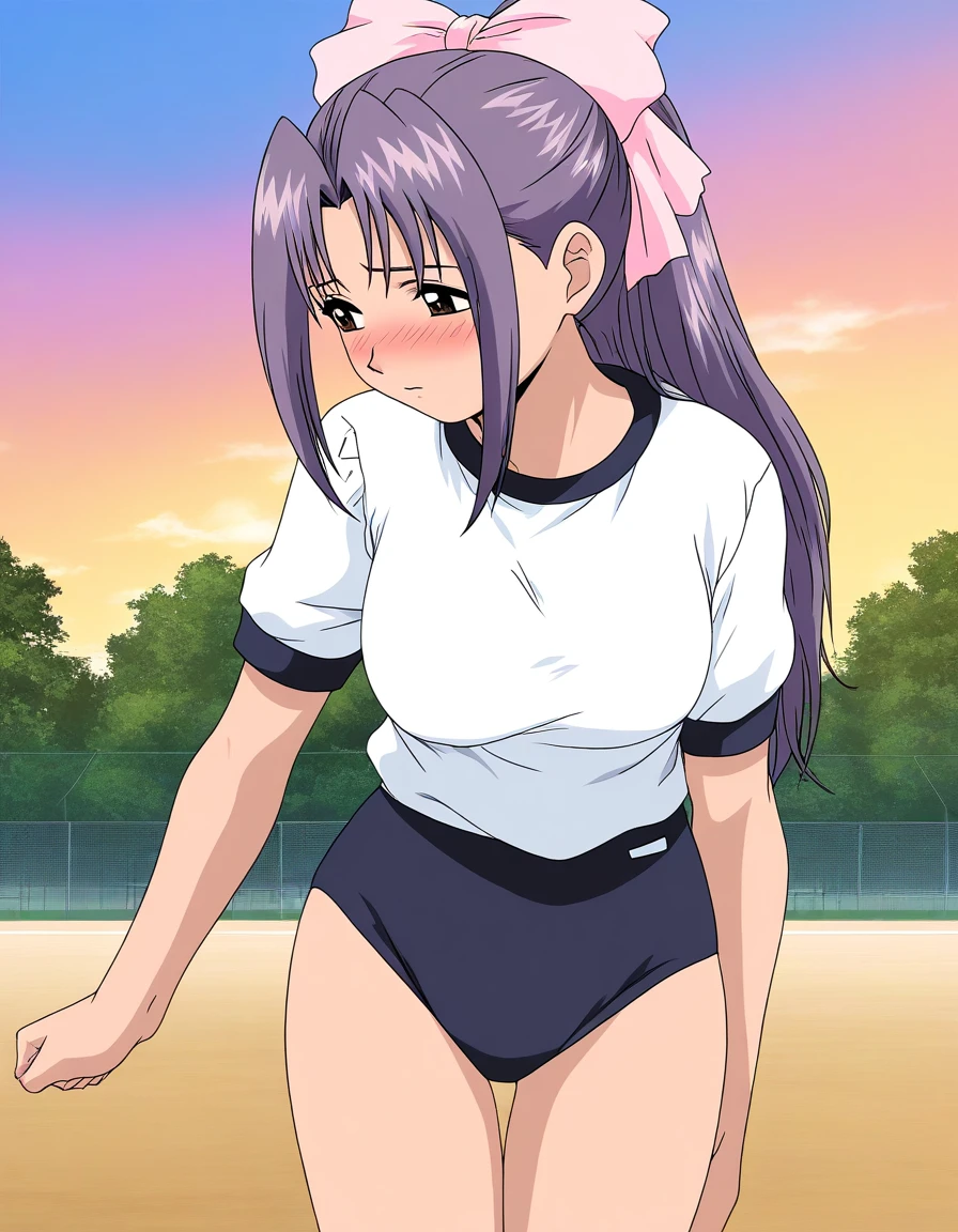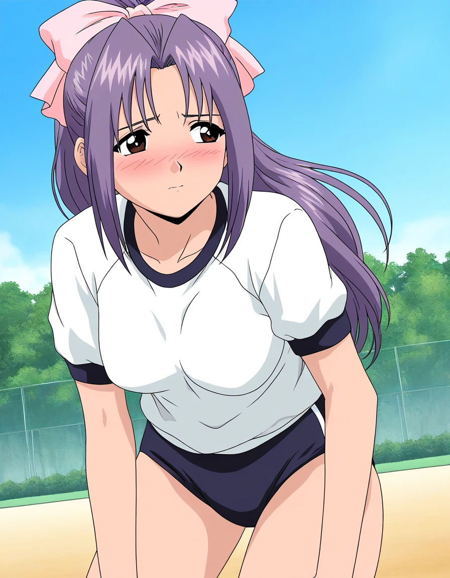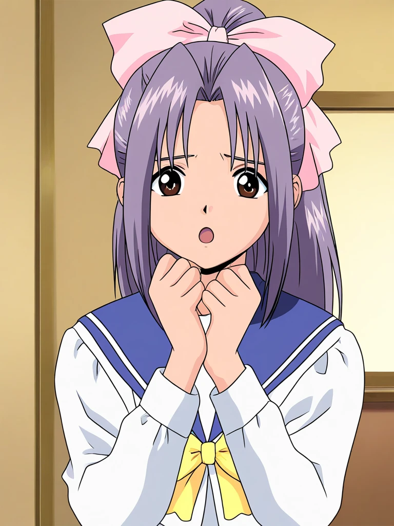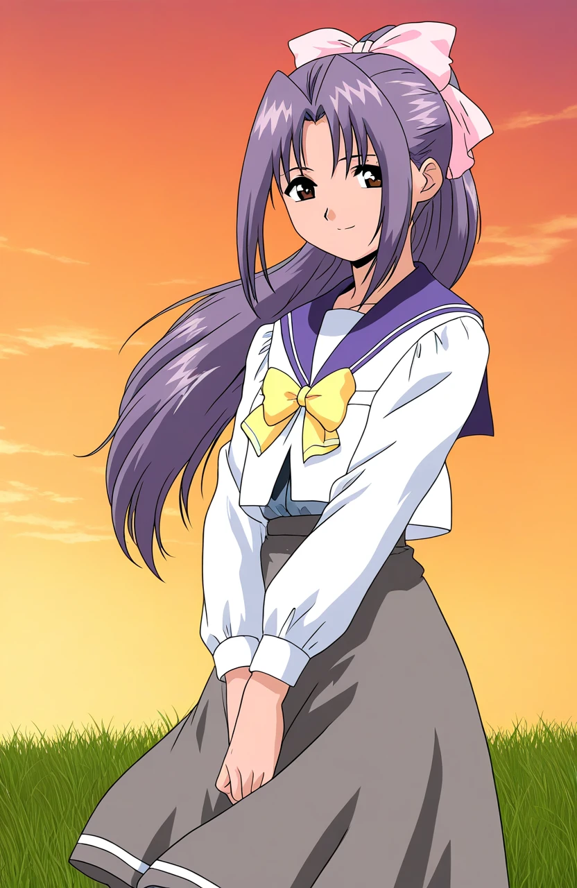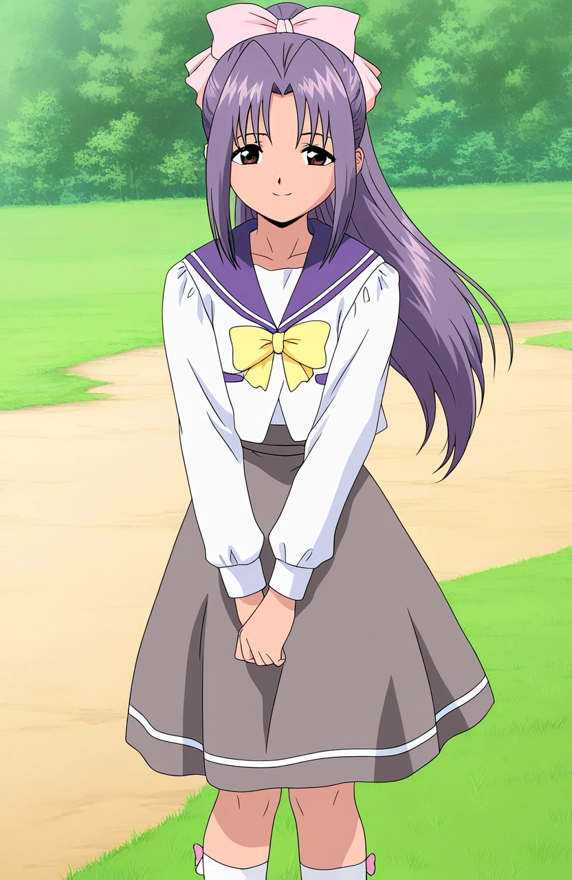 koigakubo_Momoko, purple hair, long hair, hair bow, brown eyes, ponytail, pink bow,