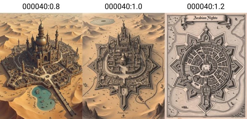 • Lora Strength: Using the LoRA at full strength (1.0) will give you a high-oblique cityscape or a bird's-eye top-down map. A Higher strength (1.2) will create more monochrome 2D city planning engraving maps, while a lower strength (0.8) will produce more 3D isometric sketched maps with color. An example is included below.