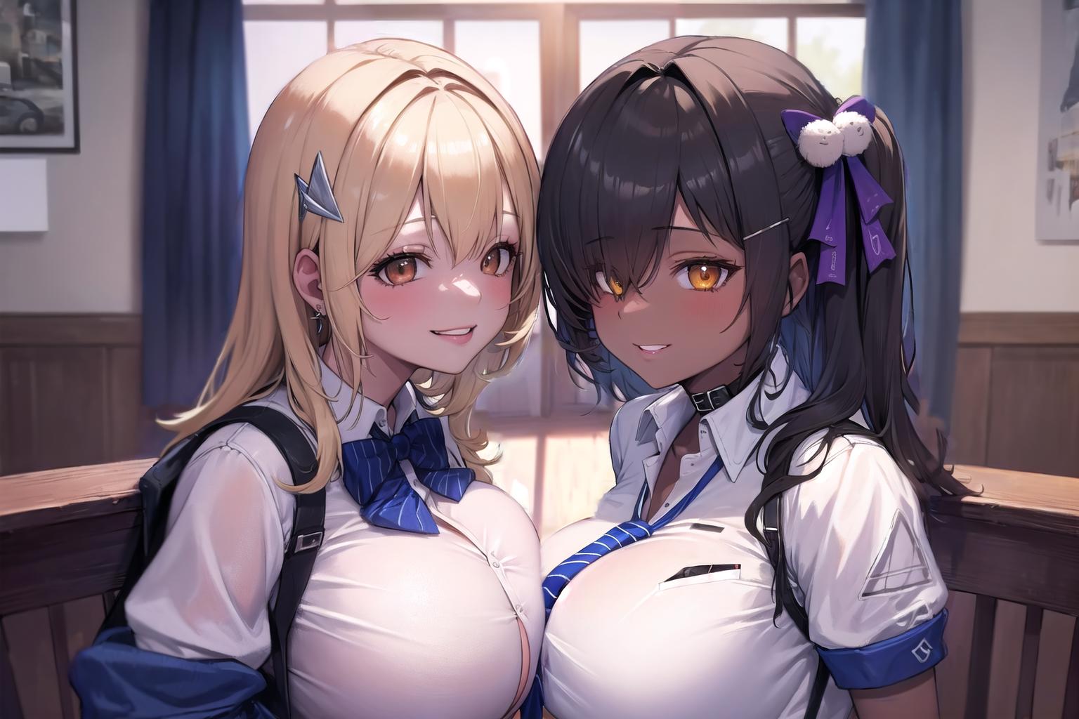 tia, hair ornament, school uniform, white shirt, bowtie, blue cardigan, long sleeves, skirt, white thighhighs, thigh strap, earrings, jewelry