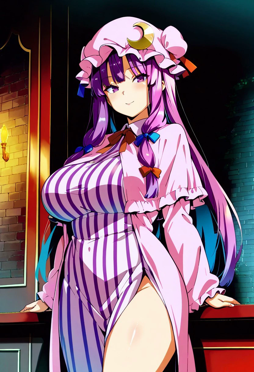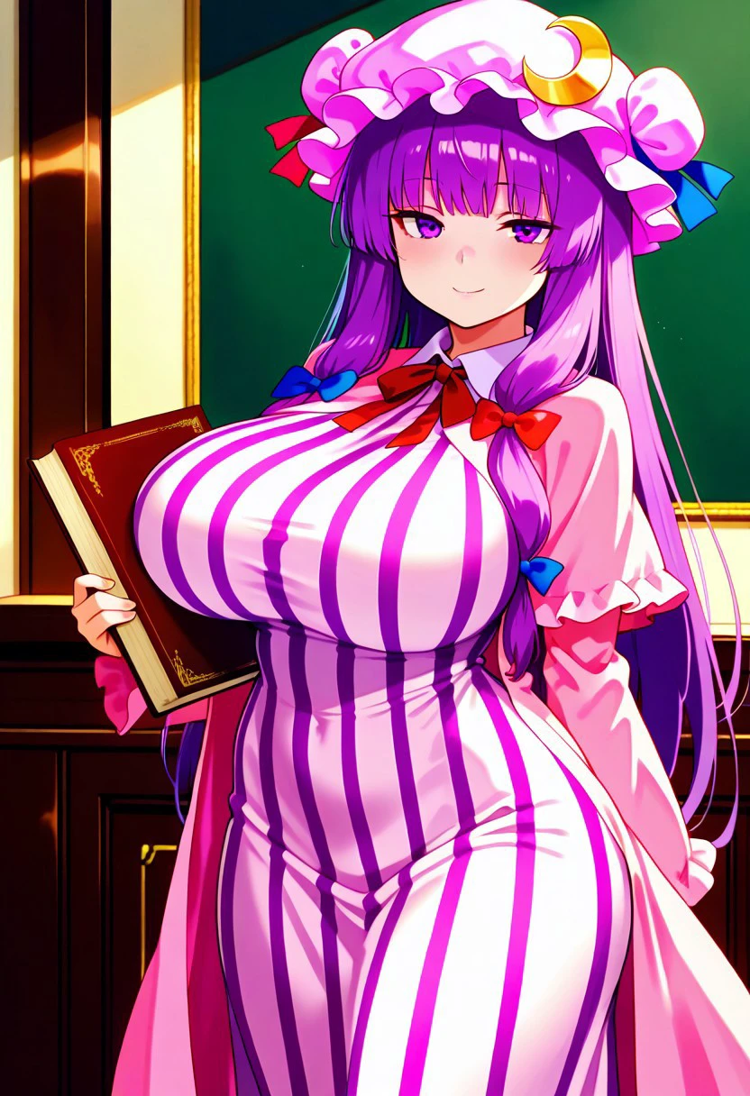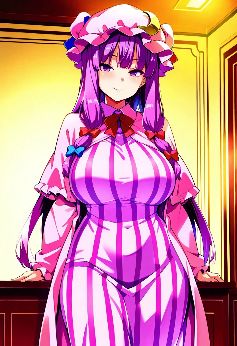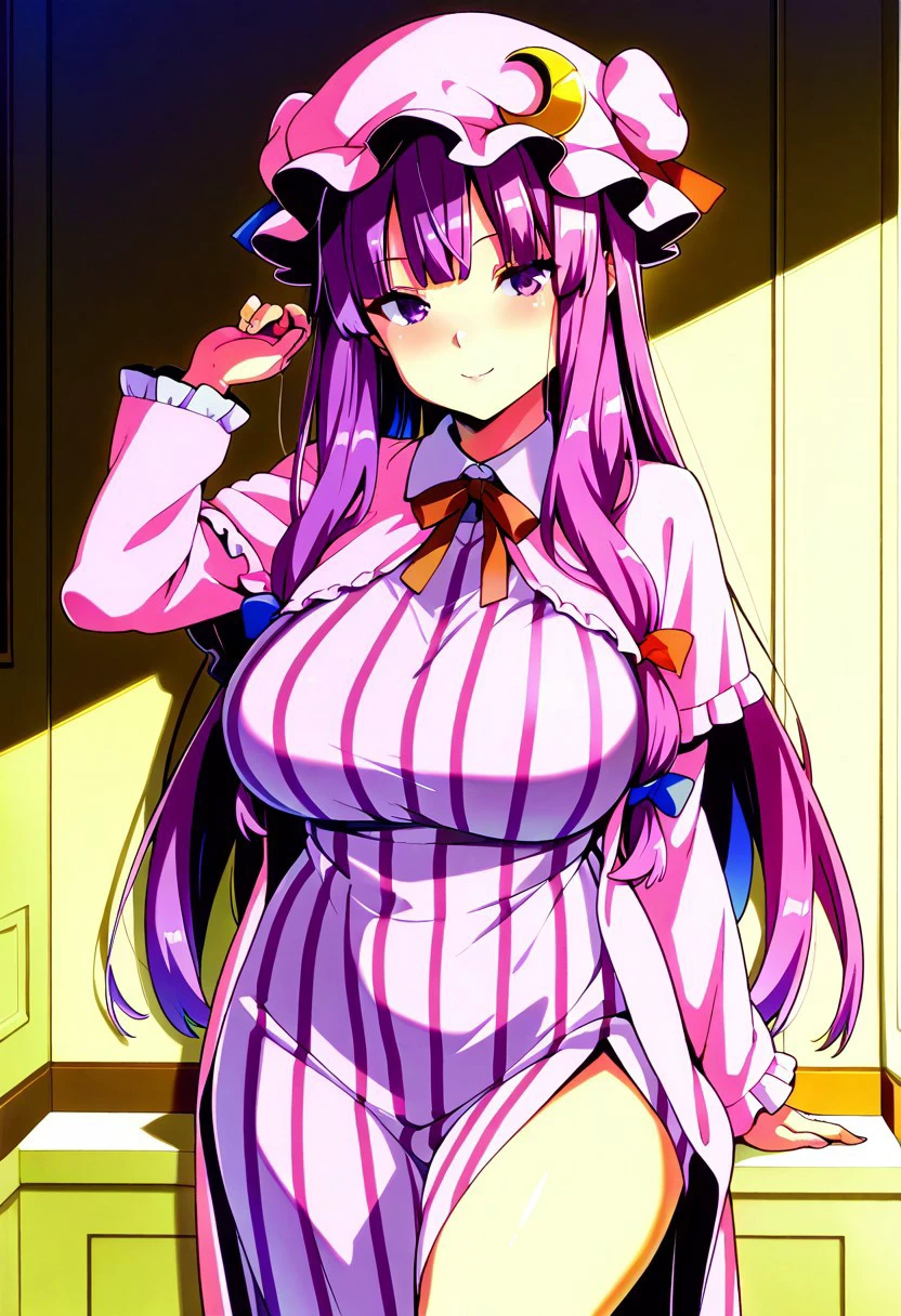 patchouli knowledge, 1girl, solo, purple hair, purple eyes, long hair, mob cap, crescent hat ornament, mob cap,