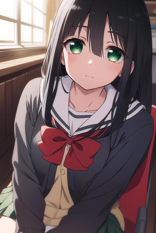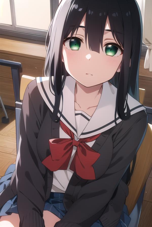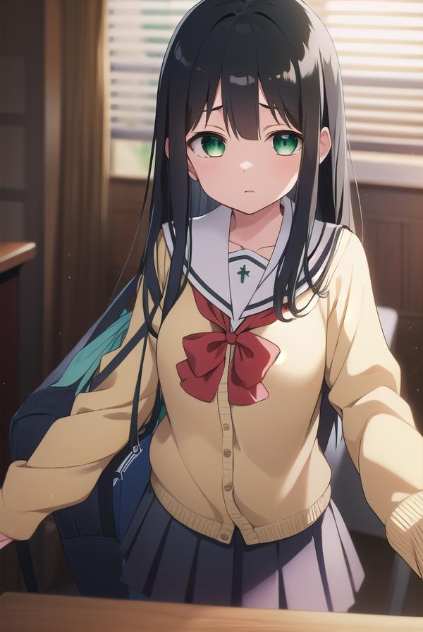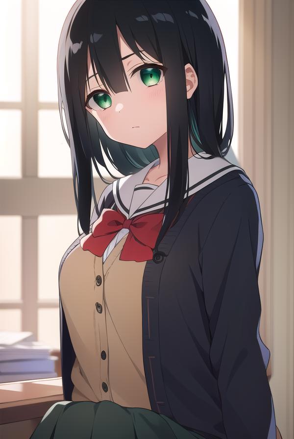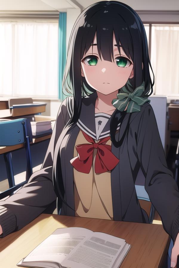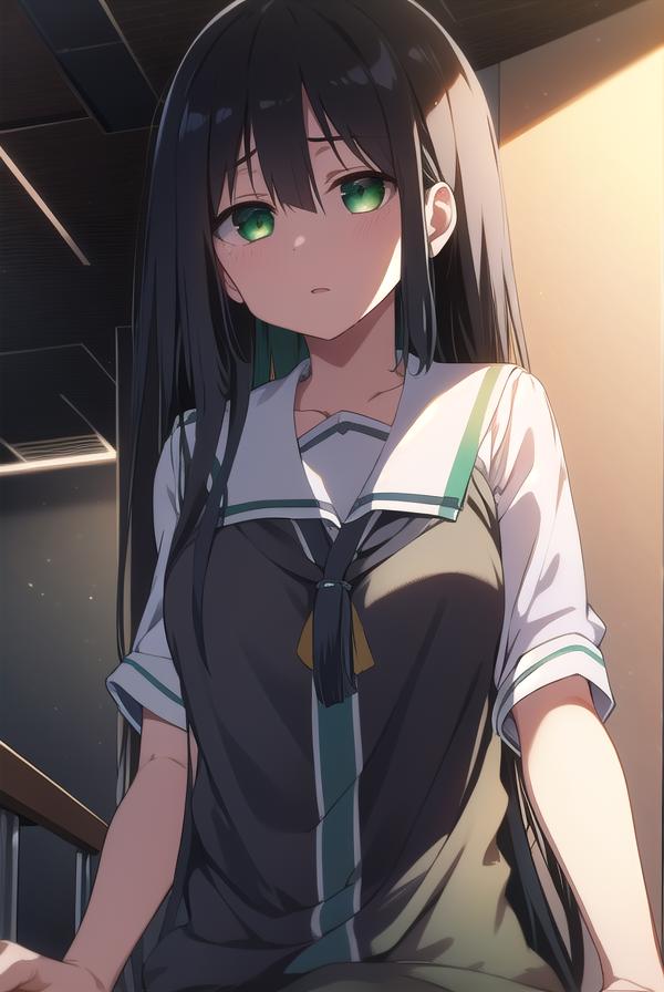 mimori tougou, long hair, (black hair:1.5), (green eyes:1.5),