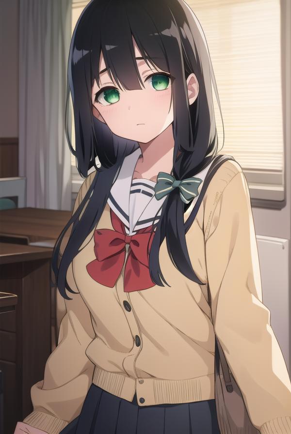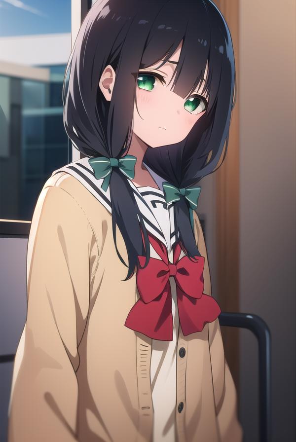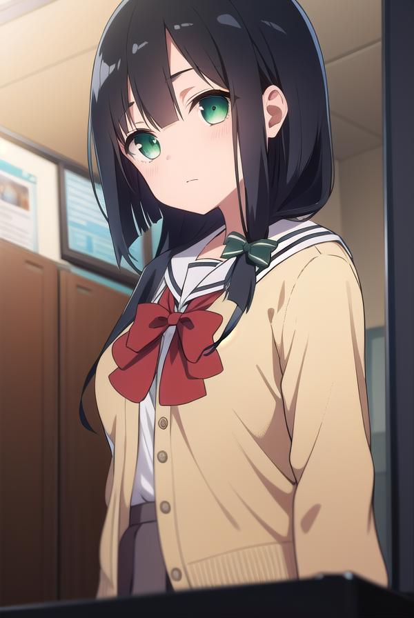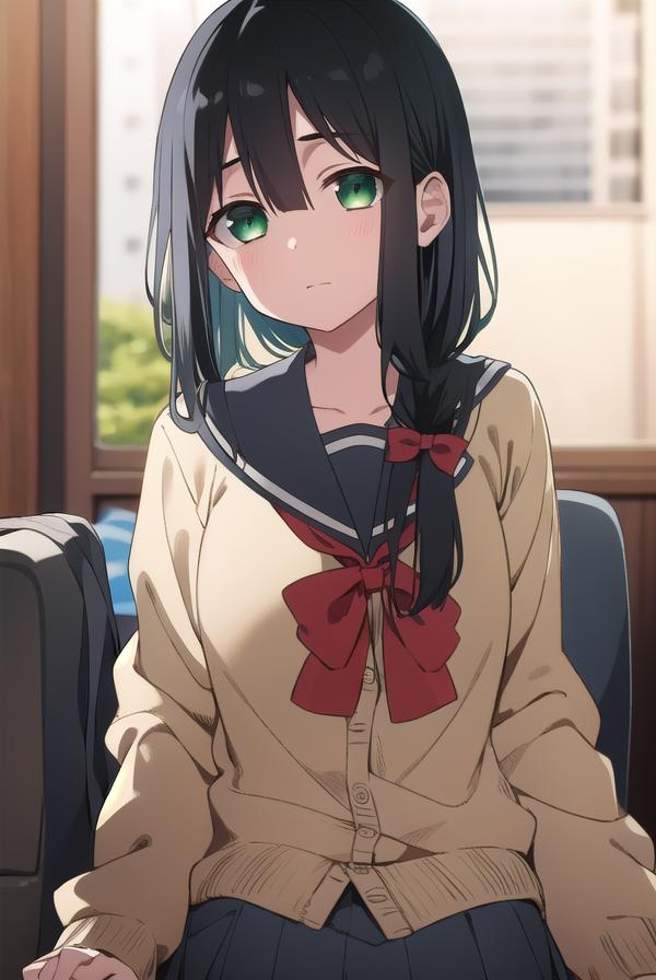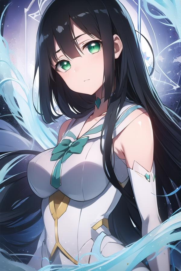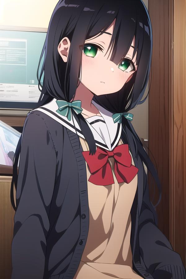 mimori tougou, long hair, (black hair:1.5), (green eyes:1.5),