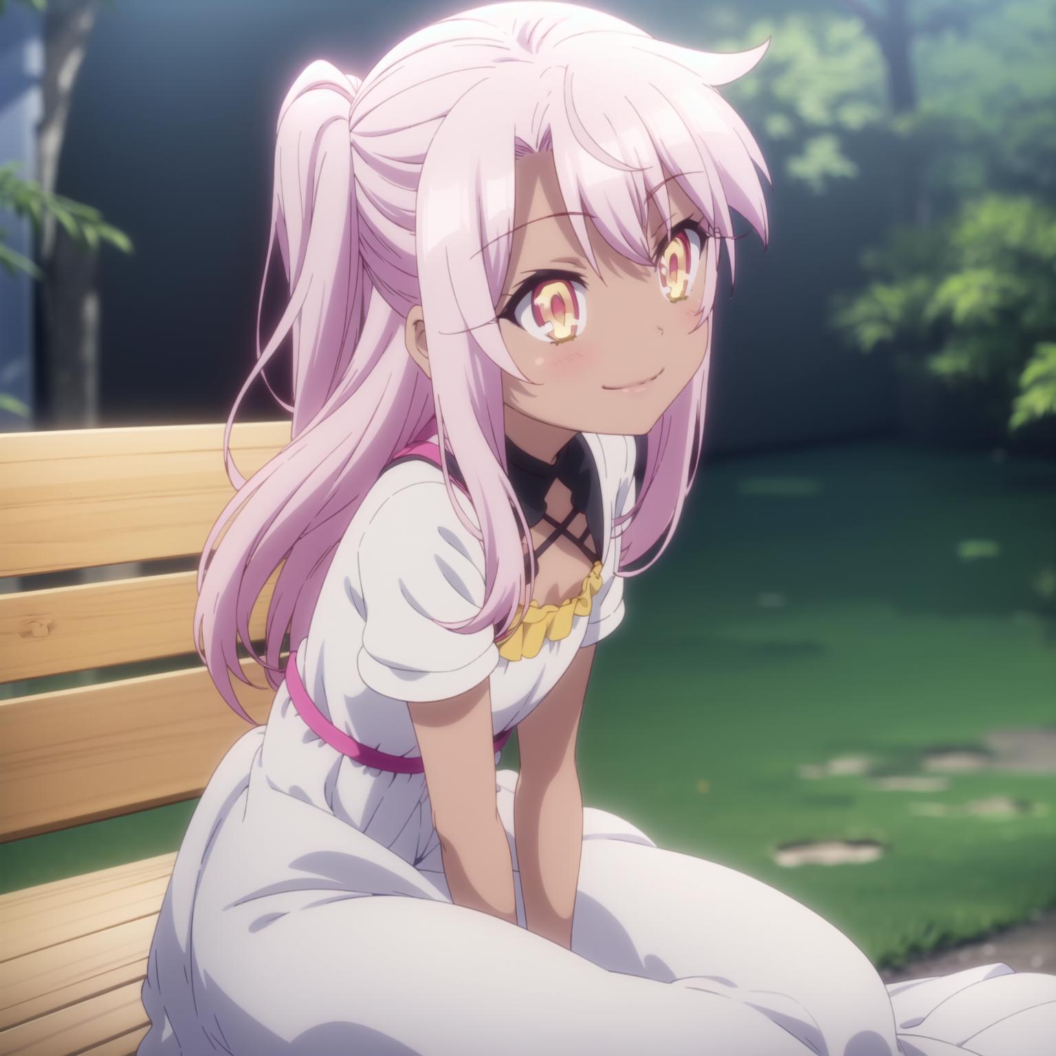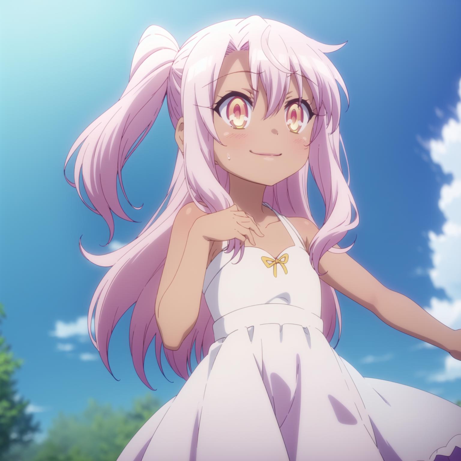 ,chloe,dark_skinned_female,dark_skin,long_hair,pink_hair,yellow_eyes,hair_between_eyes,white_hair,bangs,small_breasts,,harf_updo,one_side_up,