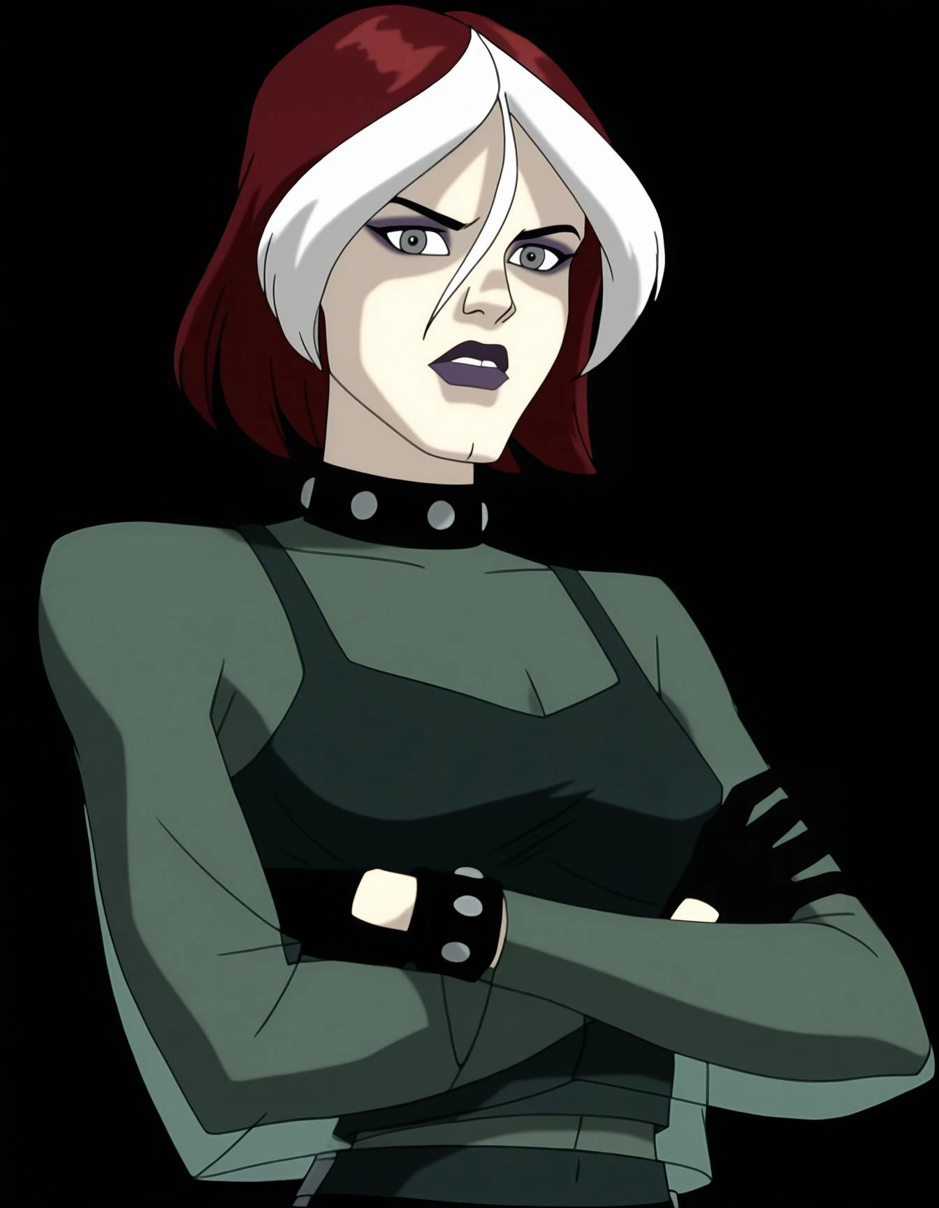 studded choker, see-through shirt, crop top, black gloves, shiny skirt, pants, boots -use "knee pads" in negative with this one-