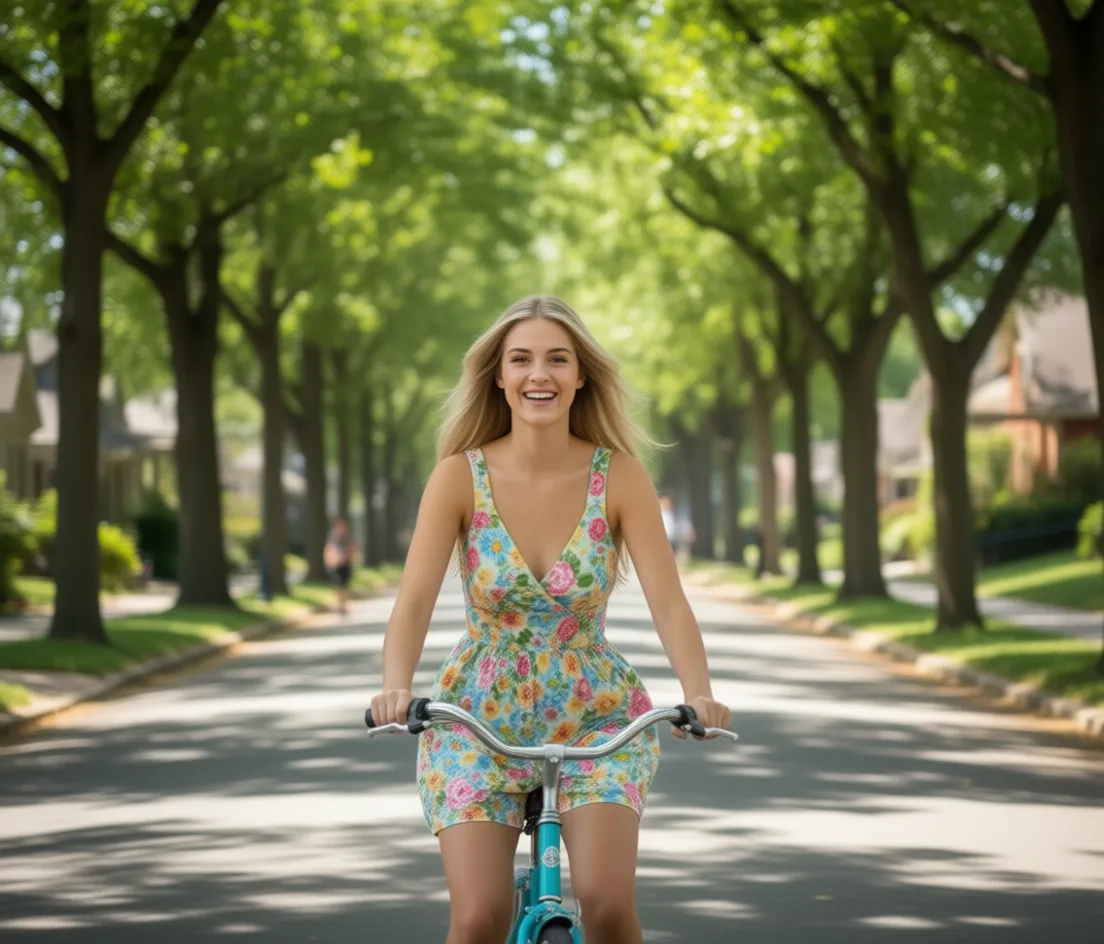 Velo Vista captura la poesía del movimiento — una chica, su bicicleta, y la belleza de las escenas cambiantes. Vístela con vestidos florales, ajustes deportivos, o ropa casual de fin de semana, luego colócala contra atardeceres dorados o bulevares frondosos. Cada marco irradia realismo, estilo, y serenidad.