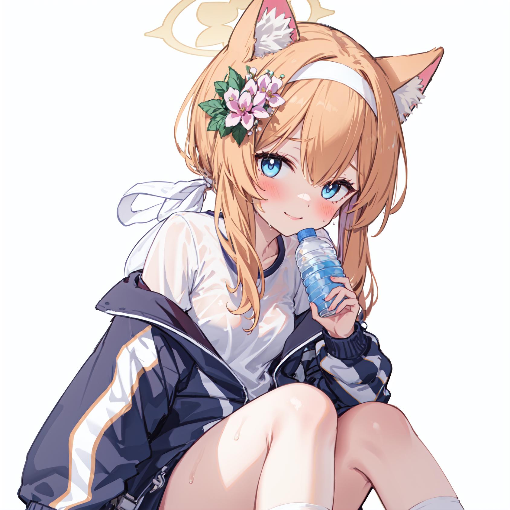 mariTrack, flower, hair flower, mari (blue archive), animal ears, hair ornament, halo, jacket, long hair, shoes, socks, shirt, animal ear fluff, blue eyes,official alternate costume, white socks, orange hair, white flower, looking at viewer, white shirt, white hairband, hairband, gym uniform, long sleeves, bangs, shorts, hair between eyes, kneehighs, sneakers, ????????????, open jacket, puffy sleeves, white headband, blush, short sleeves, multicolored jacket, black jacket, two-tone jacket推荐与其他lora同时使用。