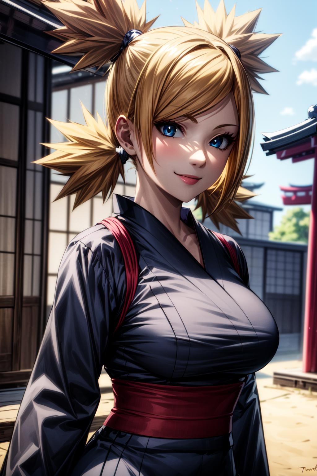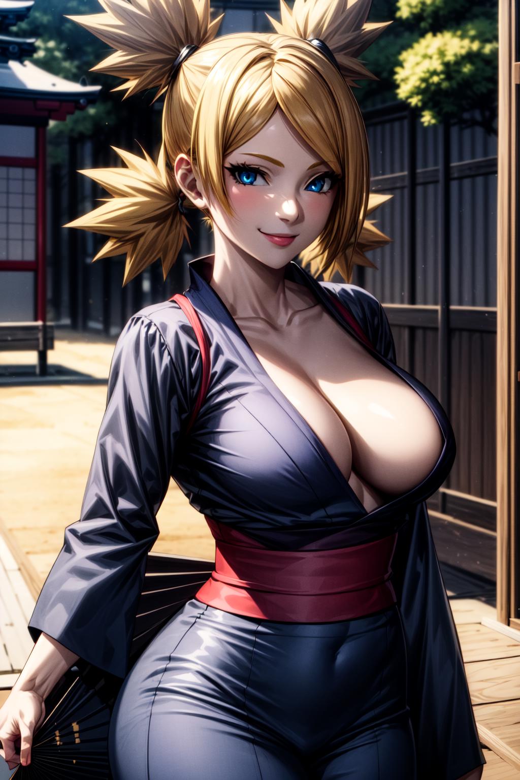 TemariNarutoNDV, 1girl, blonde hair, twintails, blue eyes, large breasts, quad tails, japanese clothes, forehead protector, black kimono