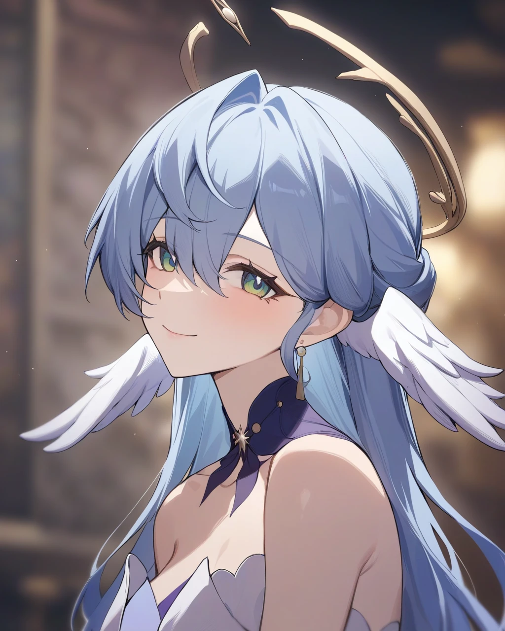 Robin(知更鸟):robin_(honkai:_star_rail),head_wings,ahoge,1girl,halo,detached_sleeves,jewelry,white_gloves,star_\(symbol\),white_dress,earrings,dress